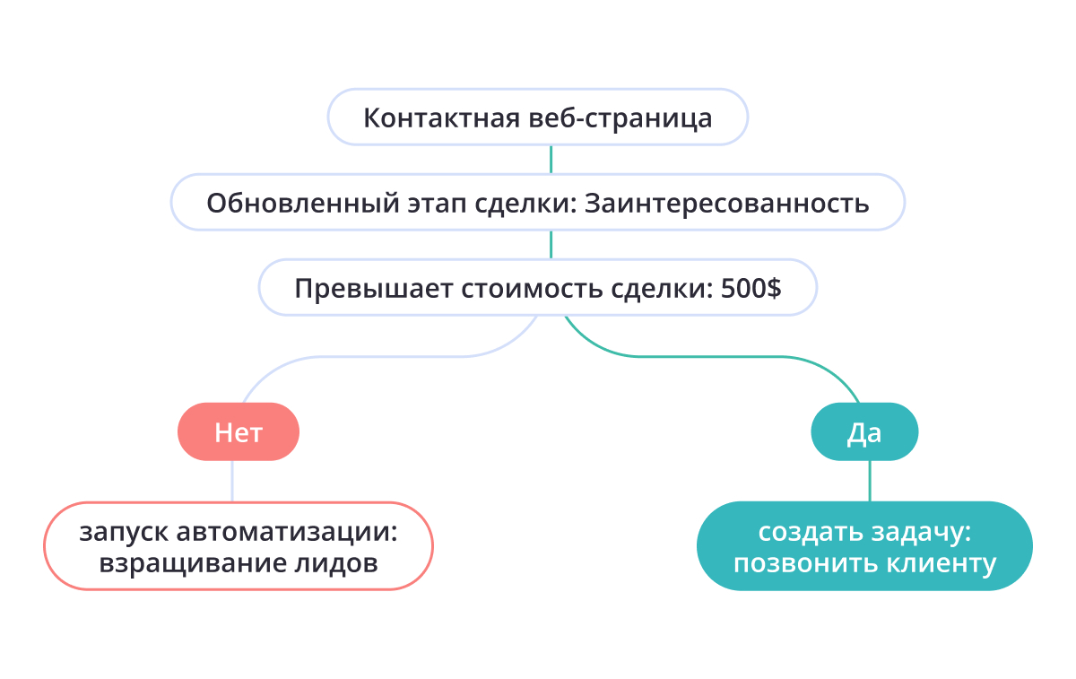 Например, операционная црм поможет автоматизировать процесс продаж. Работает так: если стоимость предполагаемой сделки больше 500 долларов (размер суммы менеджер назначает самостоятельно), то CRM автоматически поставит продавцу задачу — позвонить клиенту. Если стоимость сделки ниже 500 долларов, клиент будет автоматически передан в отдел развития продаж для увеличения суммы чека.