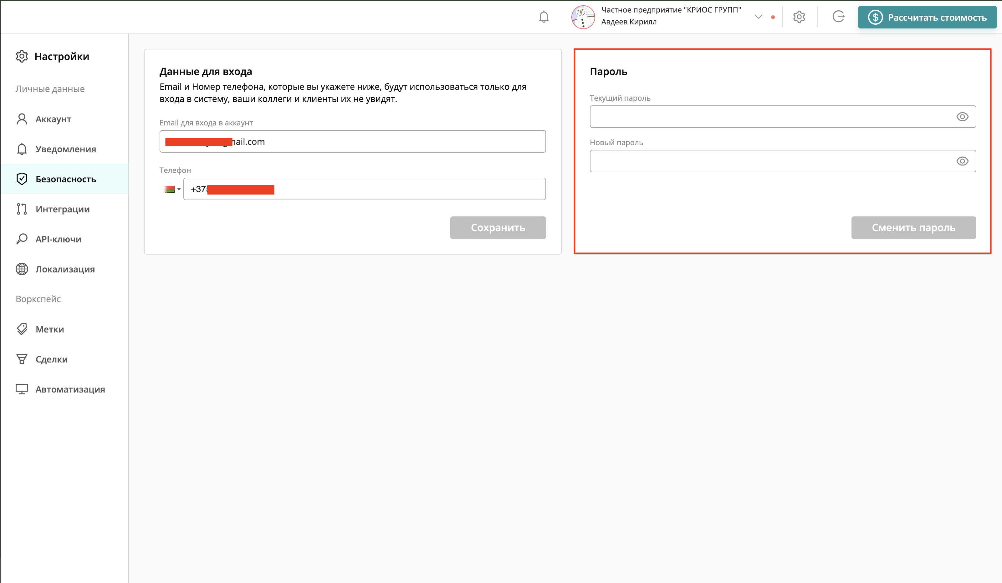 Переключитесь на вкладку «Безопасность». Заполните поля «Текущий пароль» и «Новый пароль». Далее нажмите кнопку «Изменить пароль».