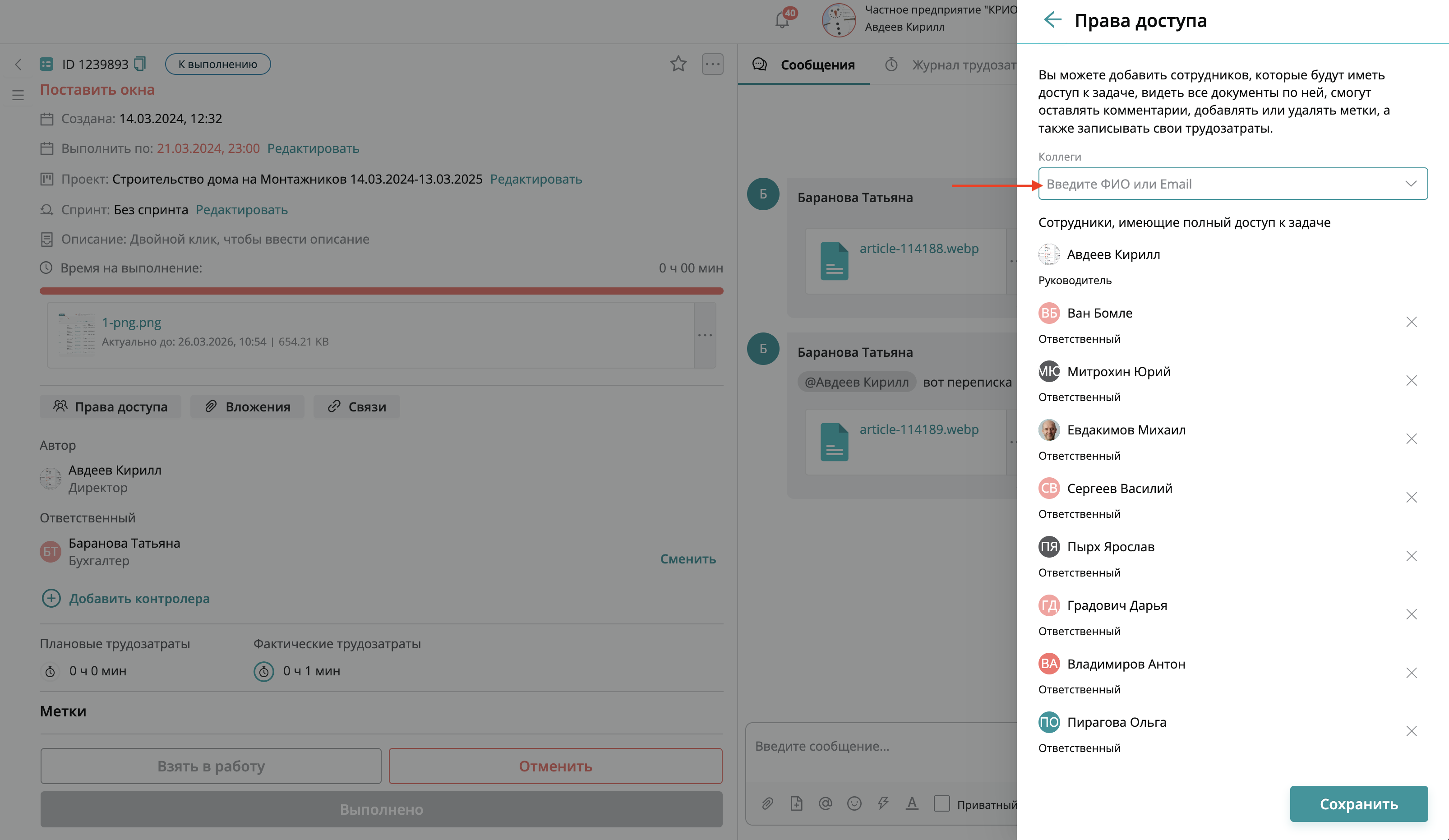 2. В поле «Права доступа» выберете коллегу из списка и нажмите «Сохранить».