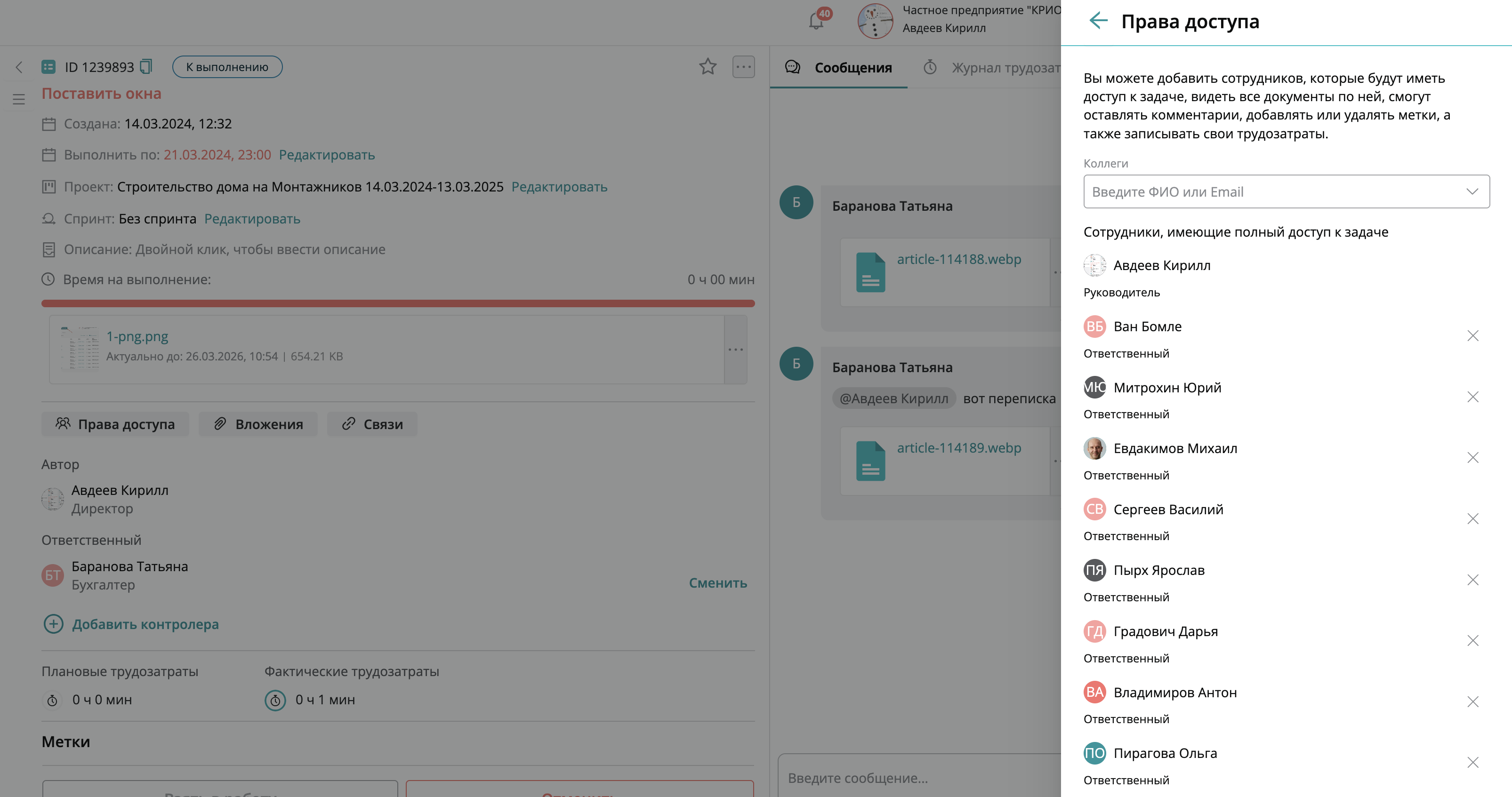 В Upservice Соисполнители — это коллеги, которые будут иметь доступ к задаче, видеть все документы по ней, смогут оставлять комментарии, добавлять или удалять метки, а также записывать свои трудозатраты. Они находятся во вкладке "Права доступа":
