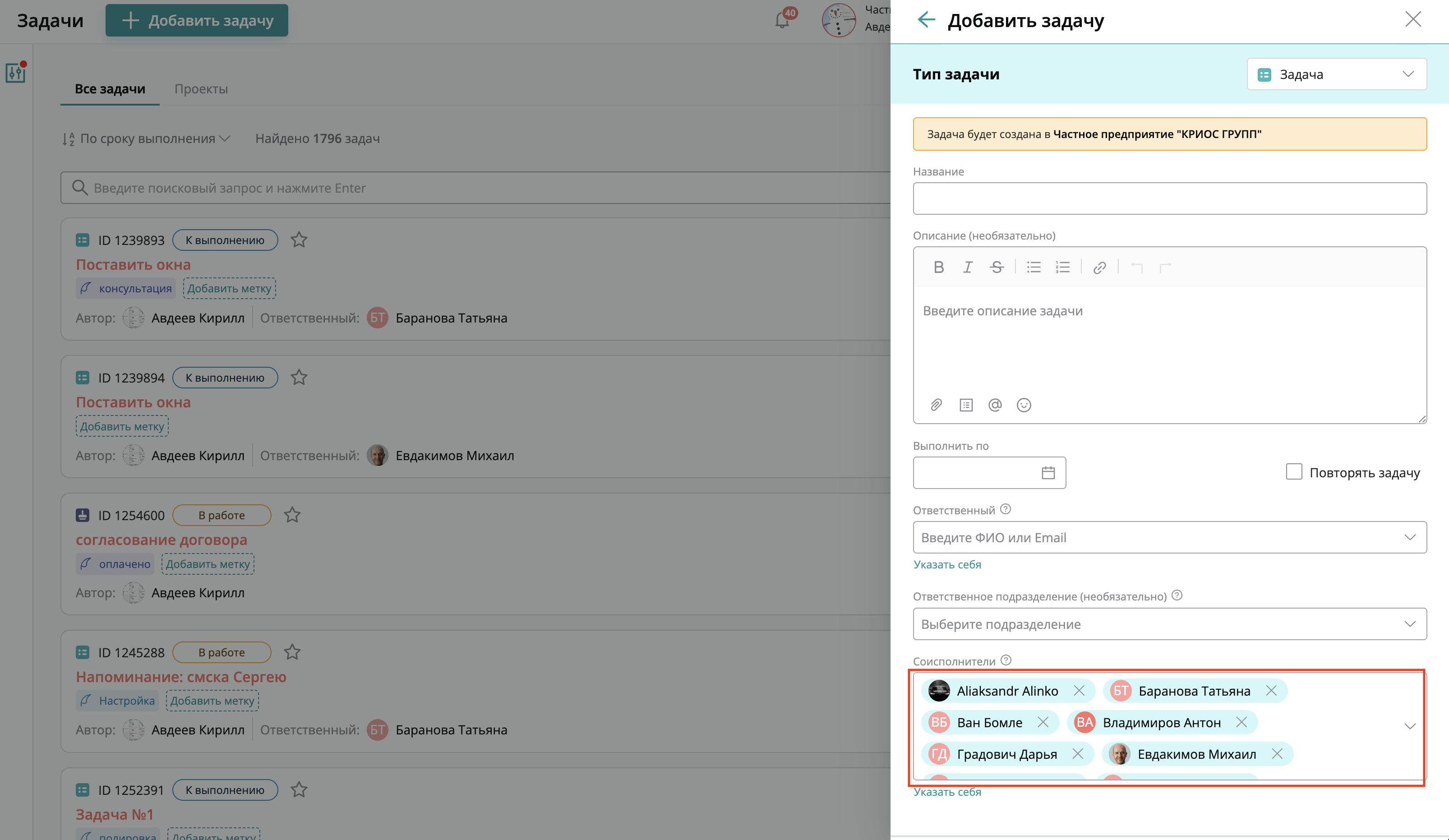 Обратите внимание: если вы создаете задачу в проекте, то все его участники автоматически становятся соисполнителями.