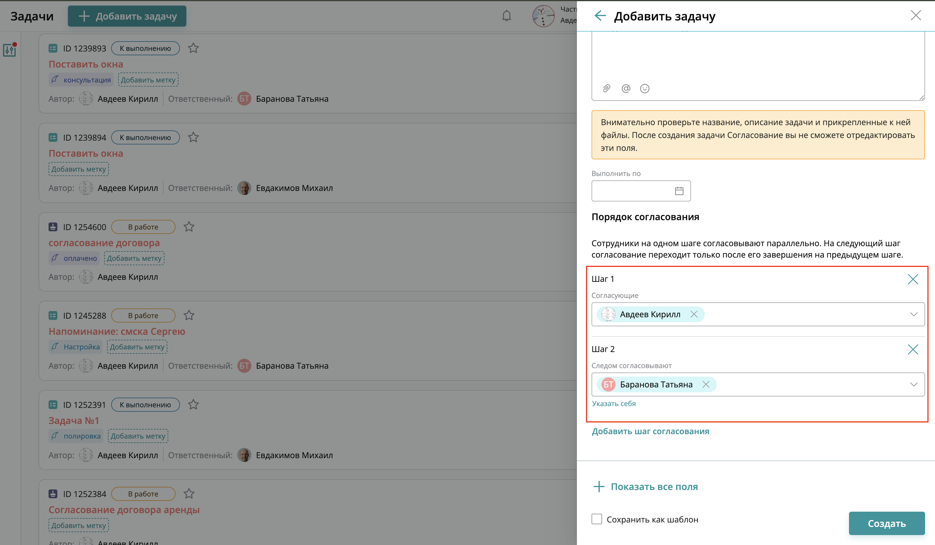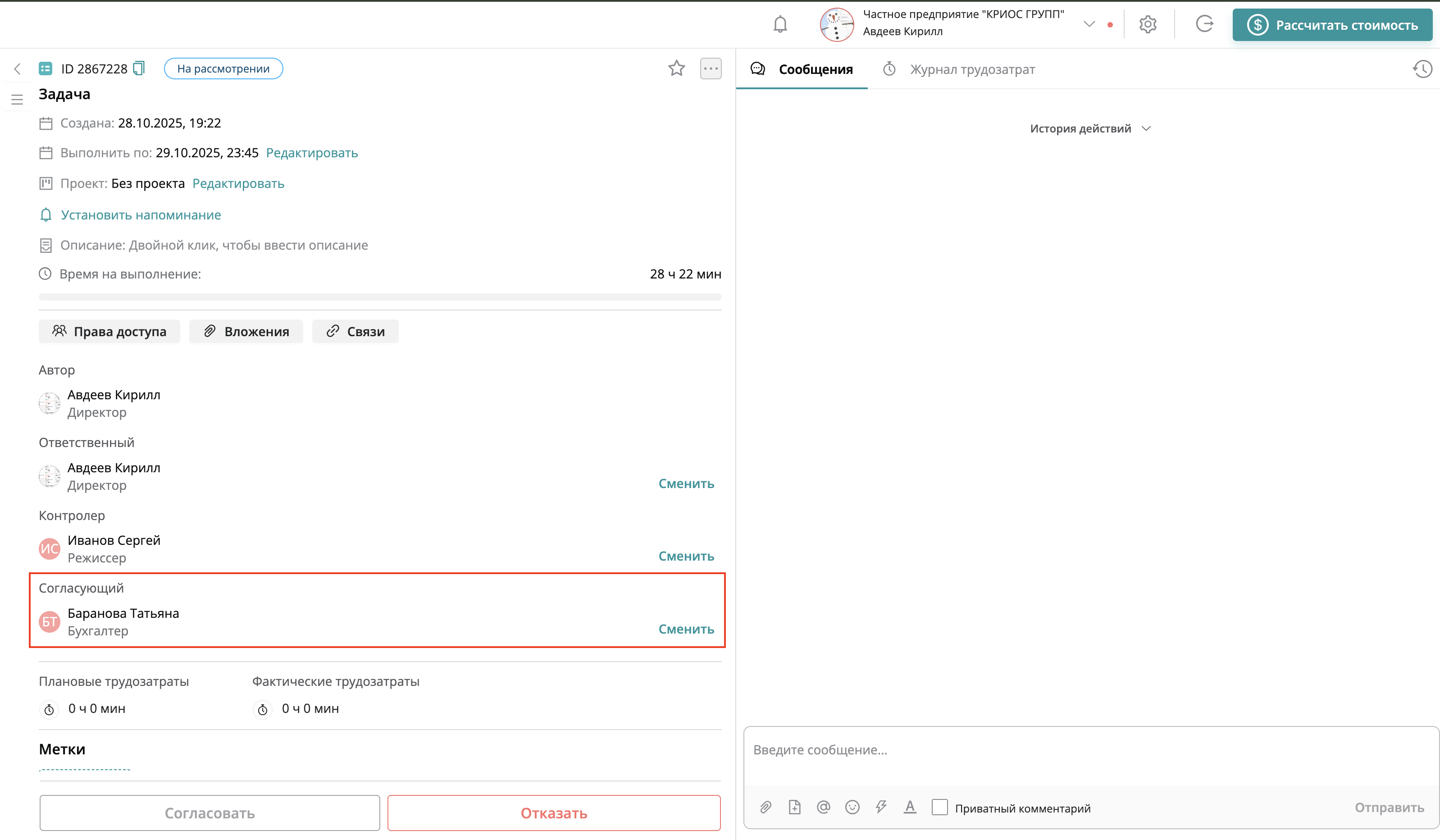 Согласующий в обычной Задаче — сотрудник, который дает разрешение на постановку задачи. Без его согласования ответственный не увидит задачу и не сможет приступить к ее выполнению. Согласующий имеет право согласовать или отказать в согласовании с указанием причины, а также редактировать задачу (название, срок ее исполнения, состав ответственных), ставить метки и оставлять комментарии к ней, добавлять соисполнителей, связи и подзадачи.