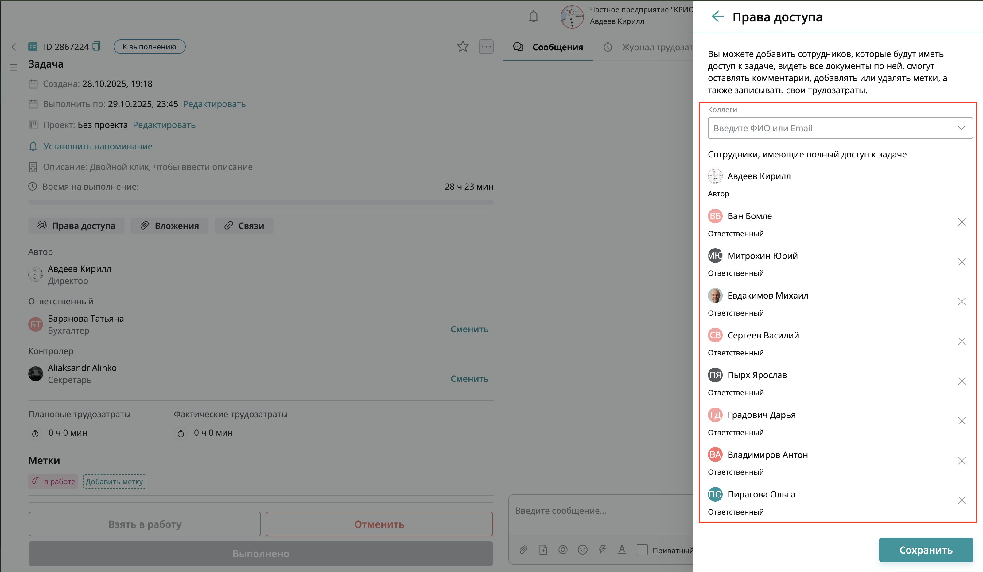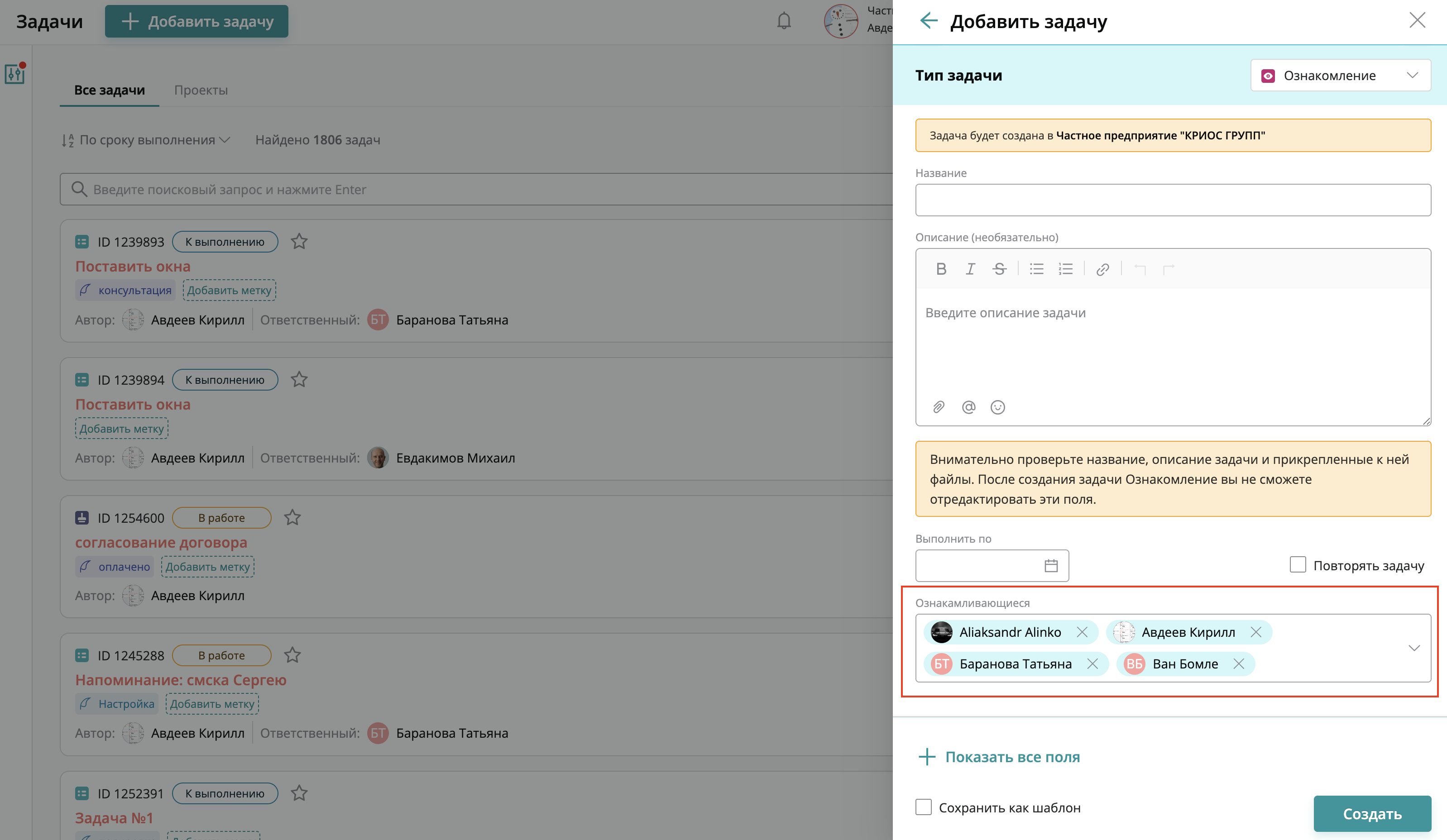 Каждый из сотрудников может Ознакомиться в задаче. Также ознакамливающиеся могут добавлять связи, соисполнителей и метки к задачам, общаться с другими коллегами.