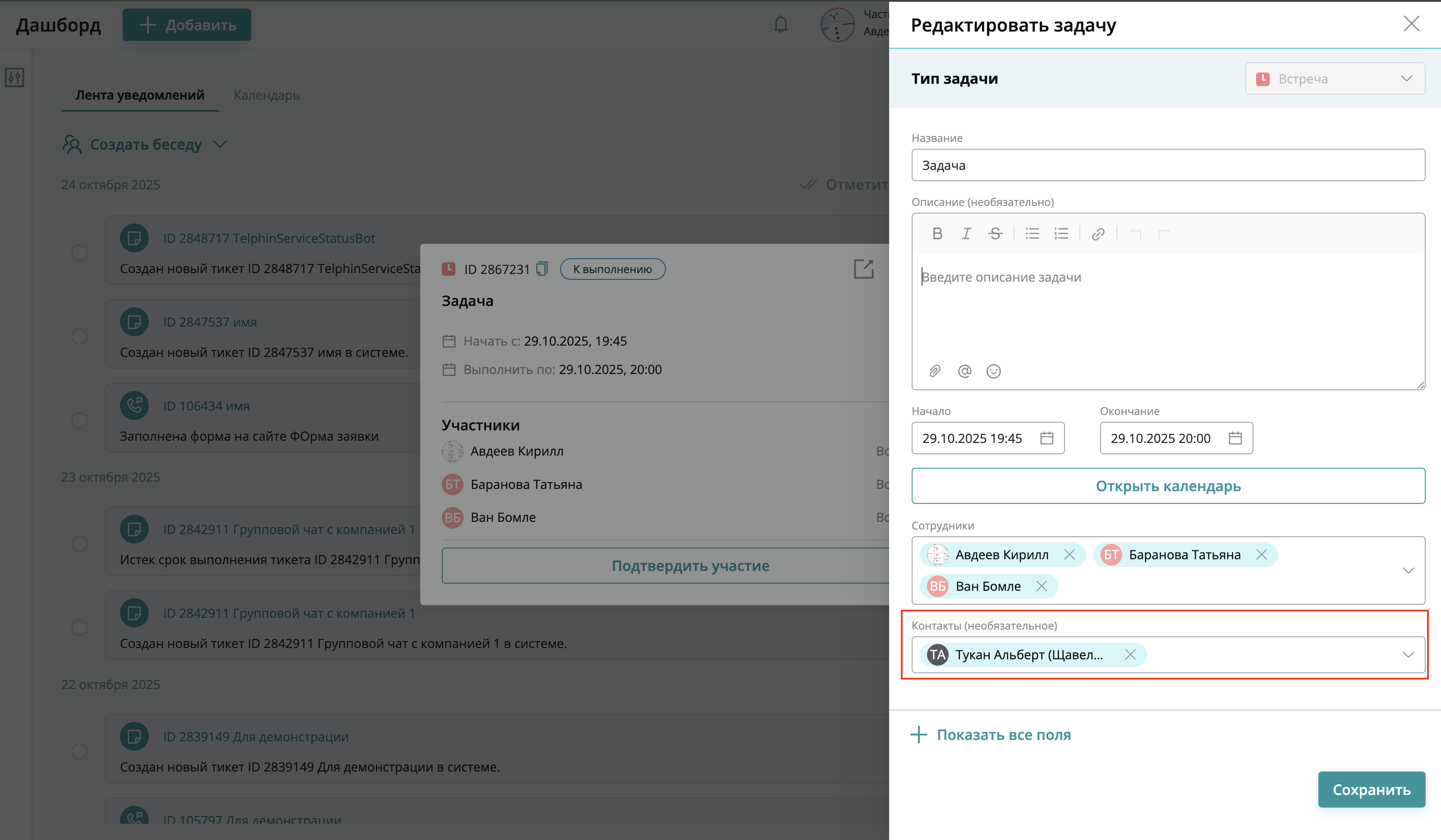 Контакты в задаче типа «Встреча» — ваши клиенты. Внешних клиентов вы также можете добавить в задачу типа «Встреча».