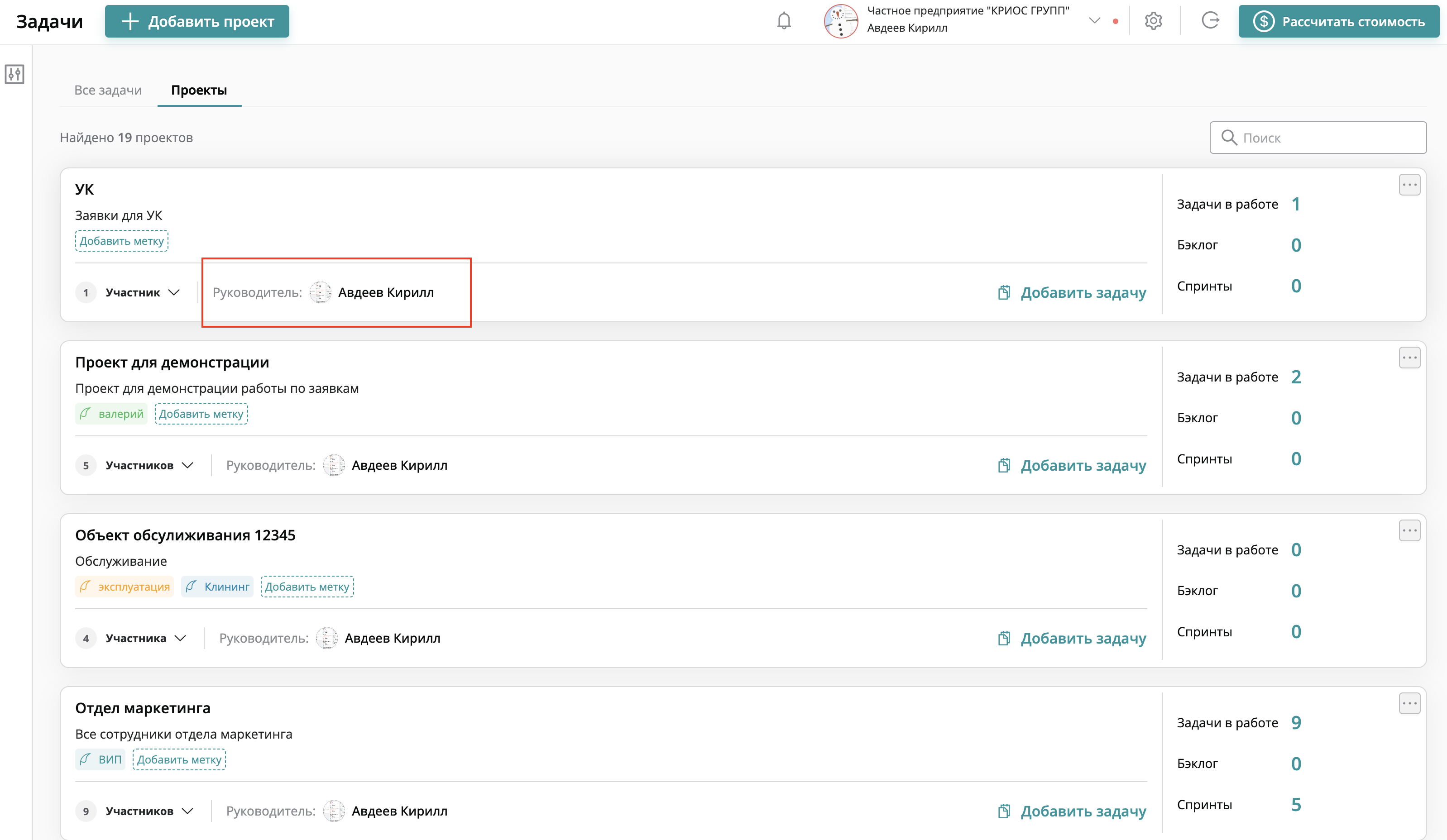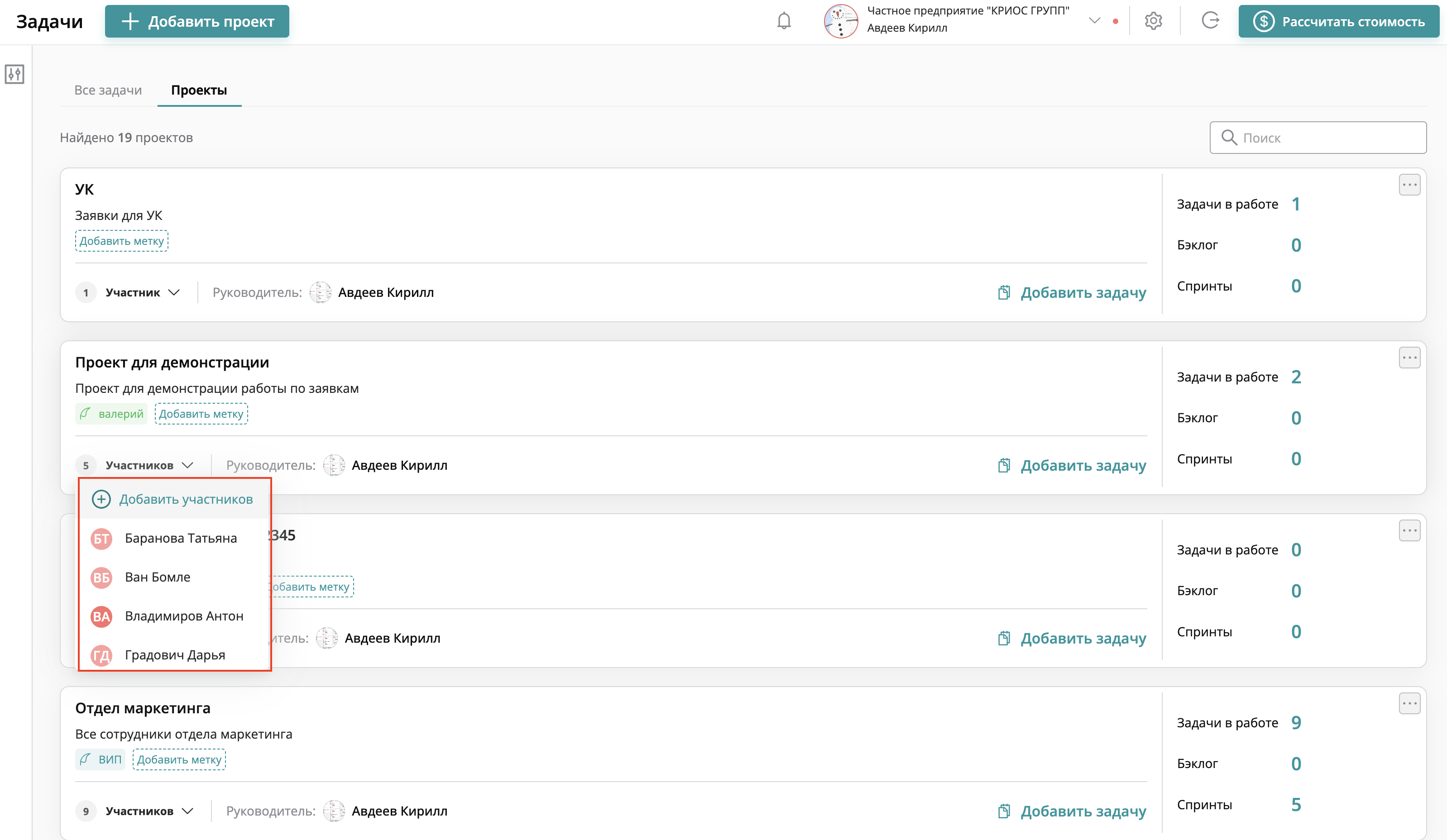 Во вкладке «Проекты» раздела «Задачи» вы можете увидеть следующие роли пользователей: