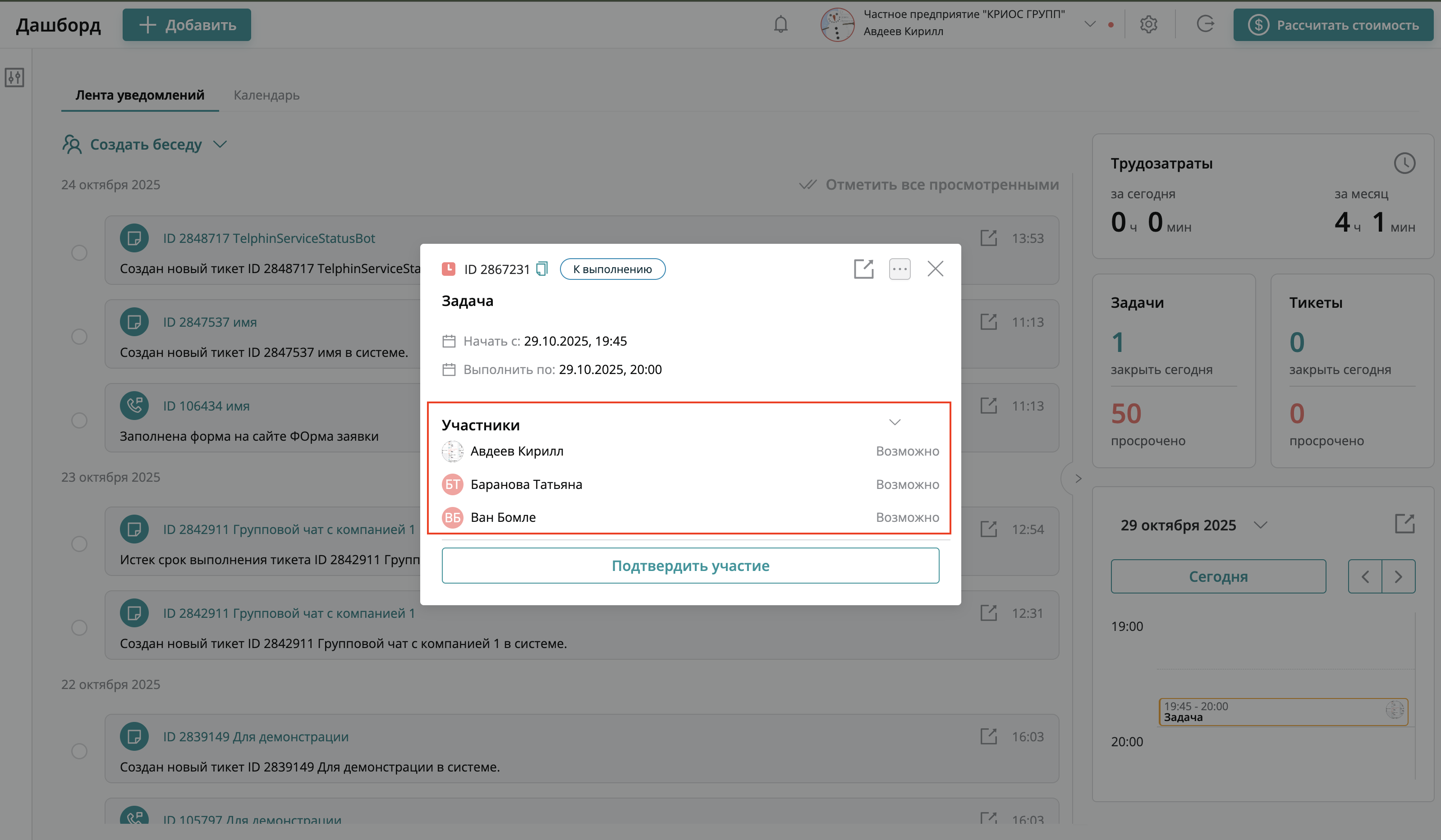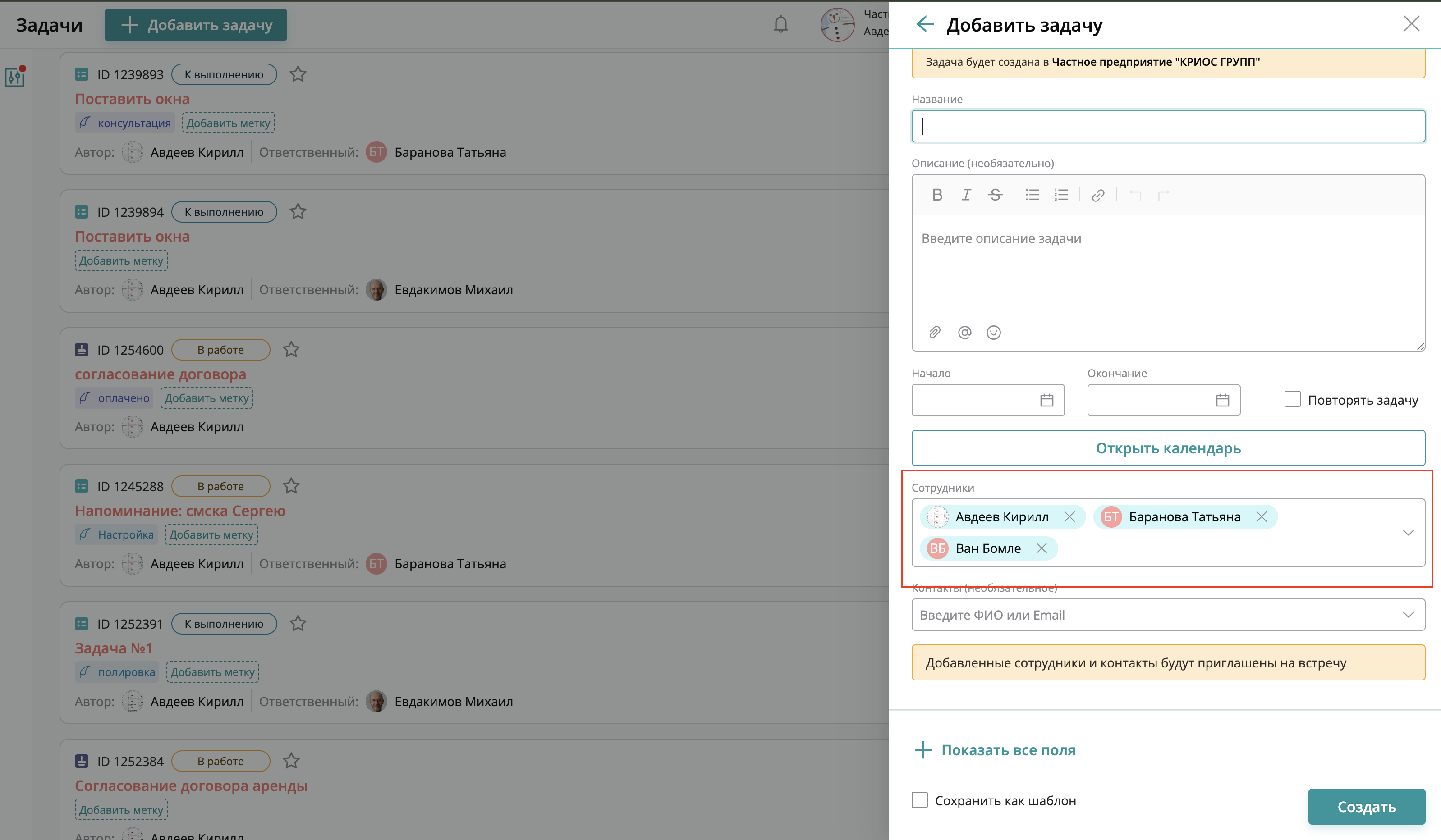 Сотрудники в задаче типа «Встреча» — ваши коллеги, которых пригласили на встречу.