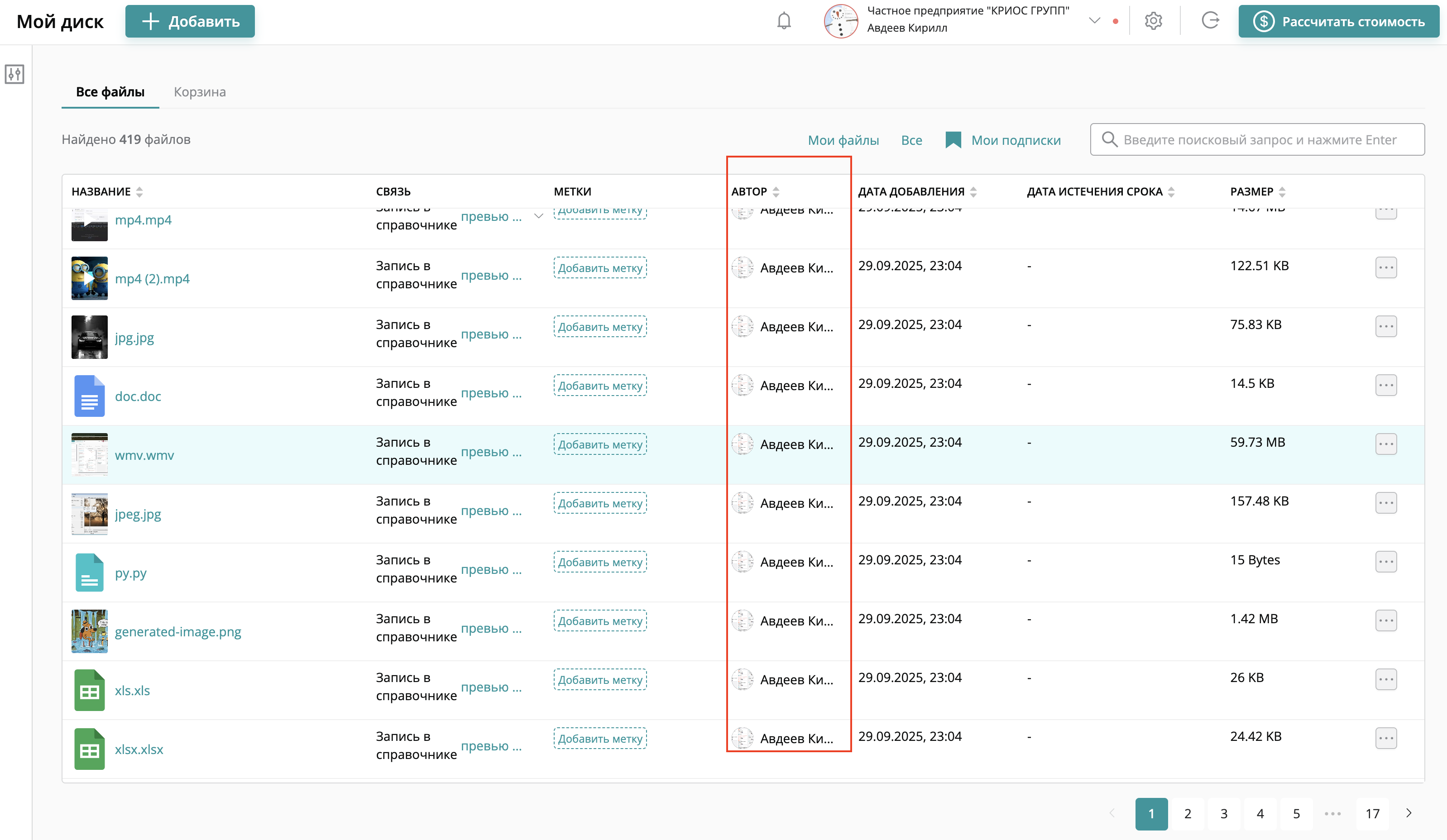Автор файла — пользователь, который загрузил или создал файл в Upservice.