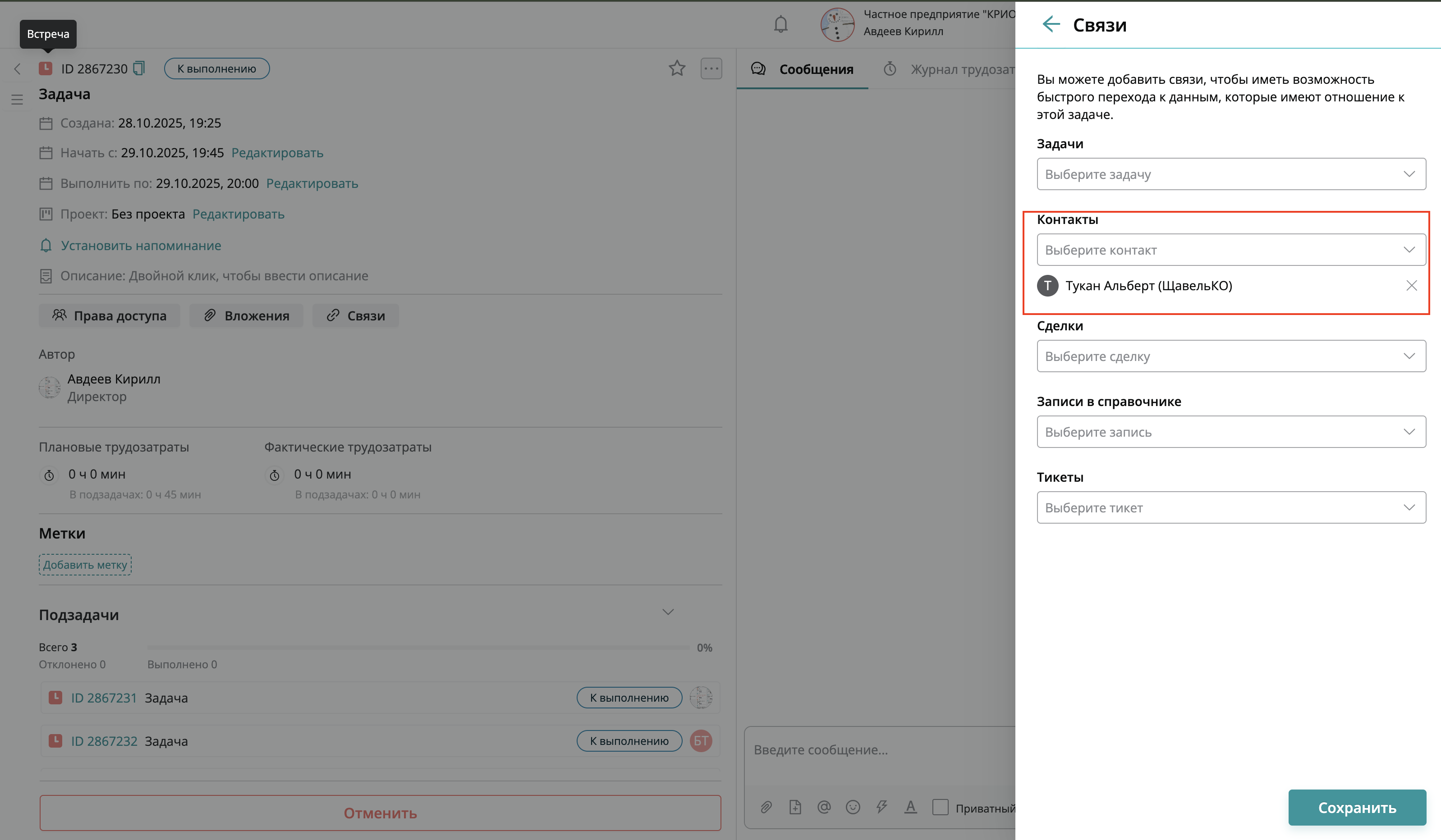 Добавленный Контакт появится в связях к задаче, но он не увидит саму задачу и комментарии, документы в ней. Добавление такого вида связи необходимо для быстрого перехода в карточку контакта и получения полной информации о второй стороне встречи.