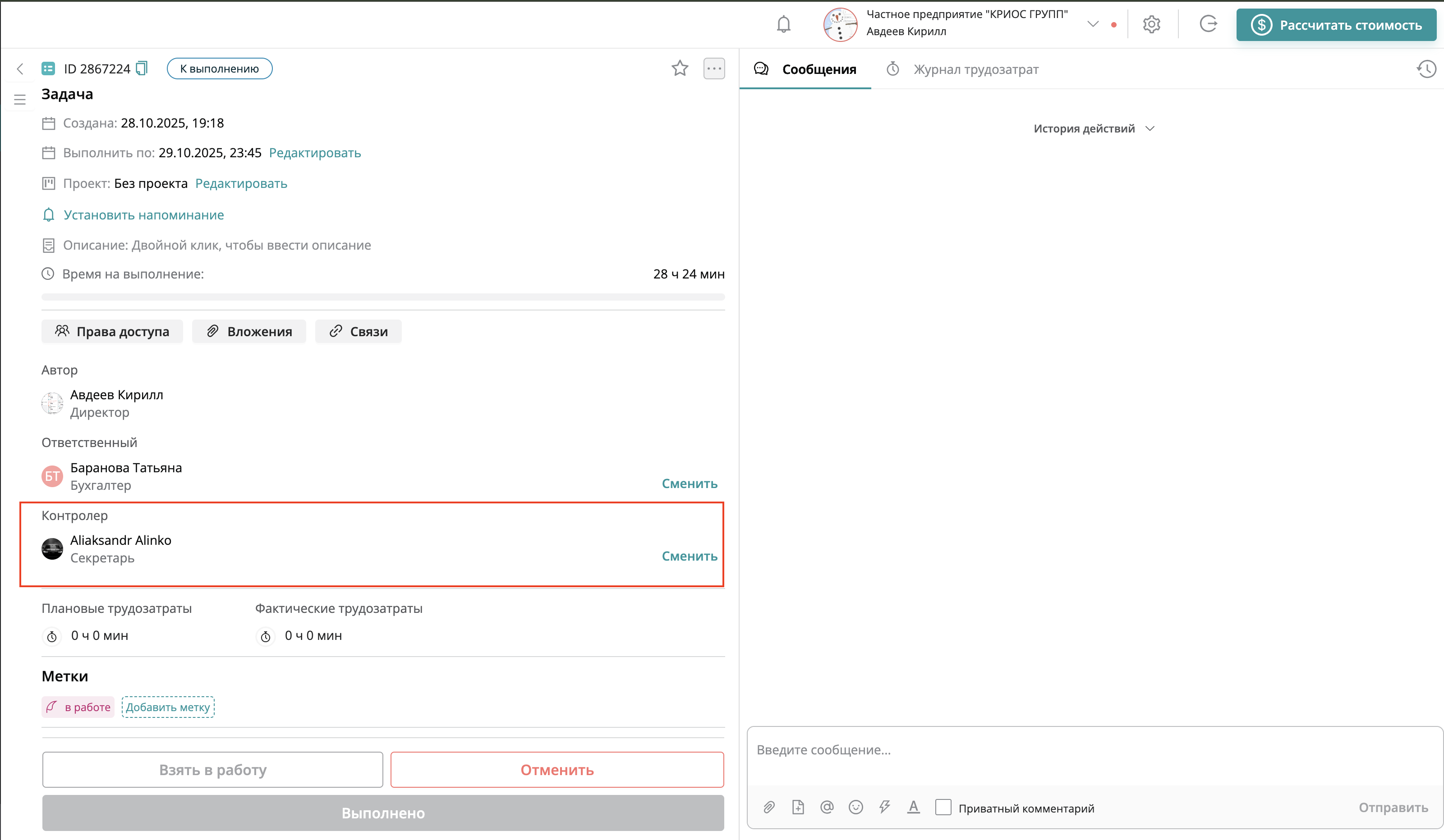 Контролер — пользователь, который проверяет качество выполнения задачи. Он может отменить задачу, закрыть (выполнить) или же вернуть в работу со своими замечаниями, добавлять связи и соисполнителей, общаться с коллегами и добавлять свои подзадачи.