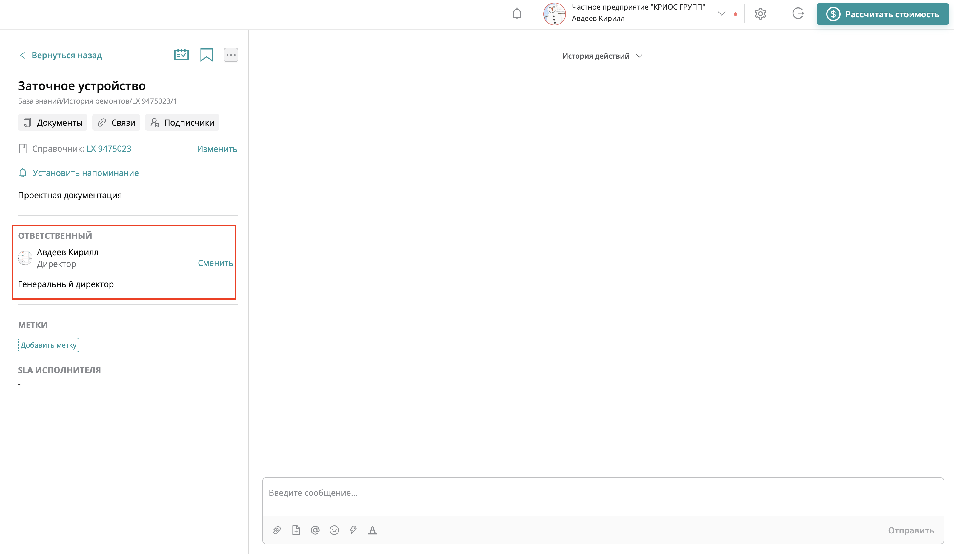 Ответственный — пользователь, который является исполнителем в заказе. У него есть право изменять статус заказа (отправлять на согласование, брать в работу, отправлять на проверку, завершать или отменять заказ), общаться с коллегами по заказу, добавлять соисполнителей, связи к заказу, менять ответственного, а также обмениваться документами с коллегами и с контрагентом, добавлять задачи по заказу.