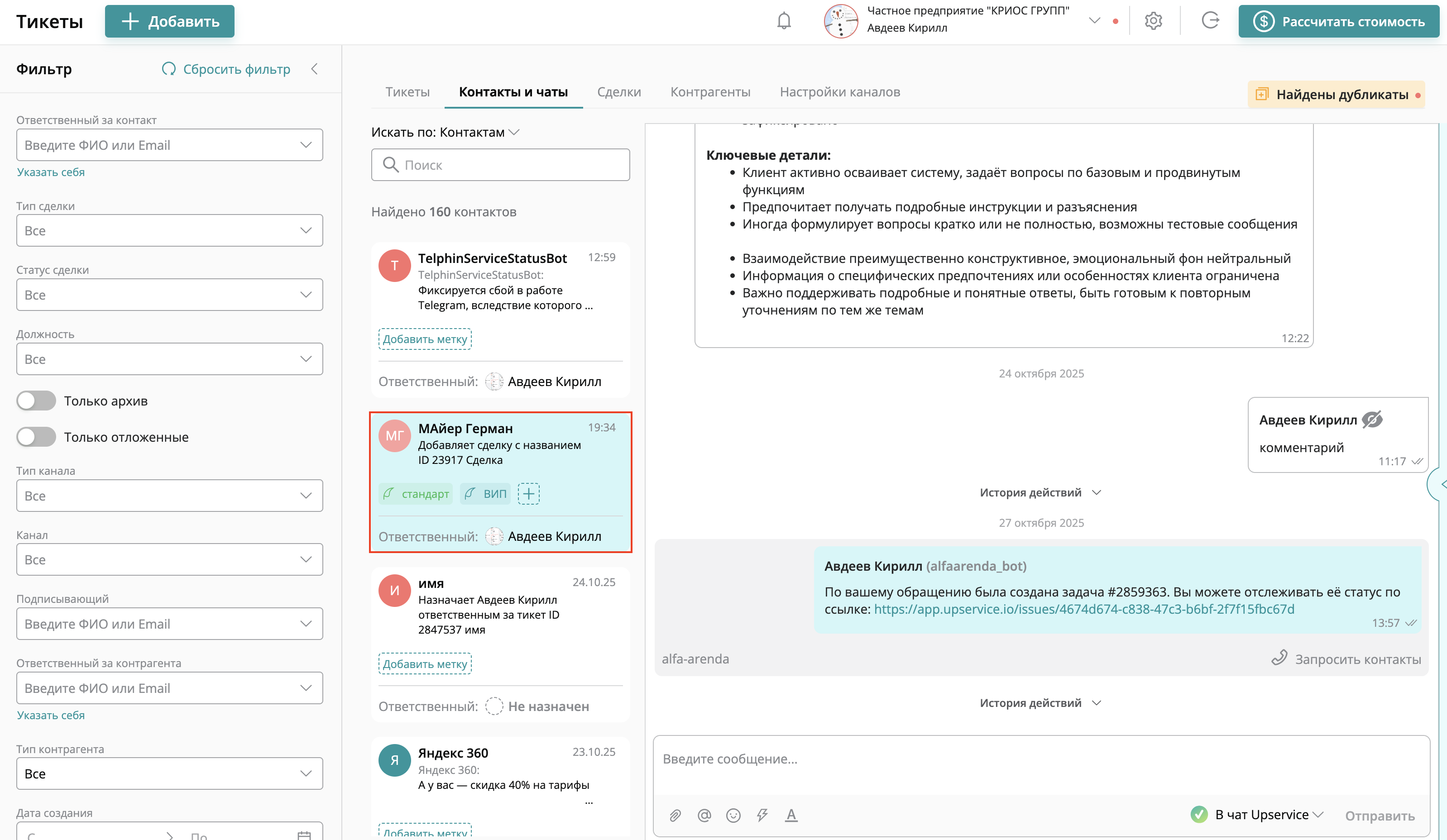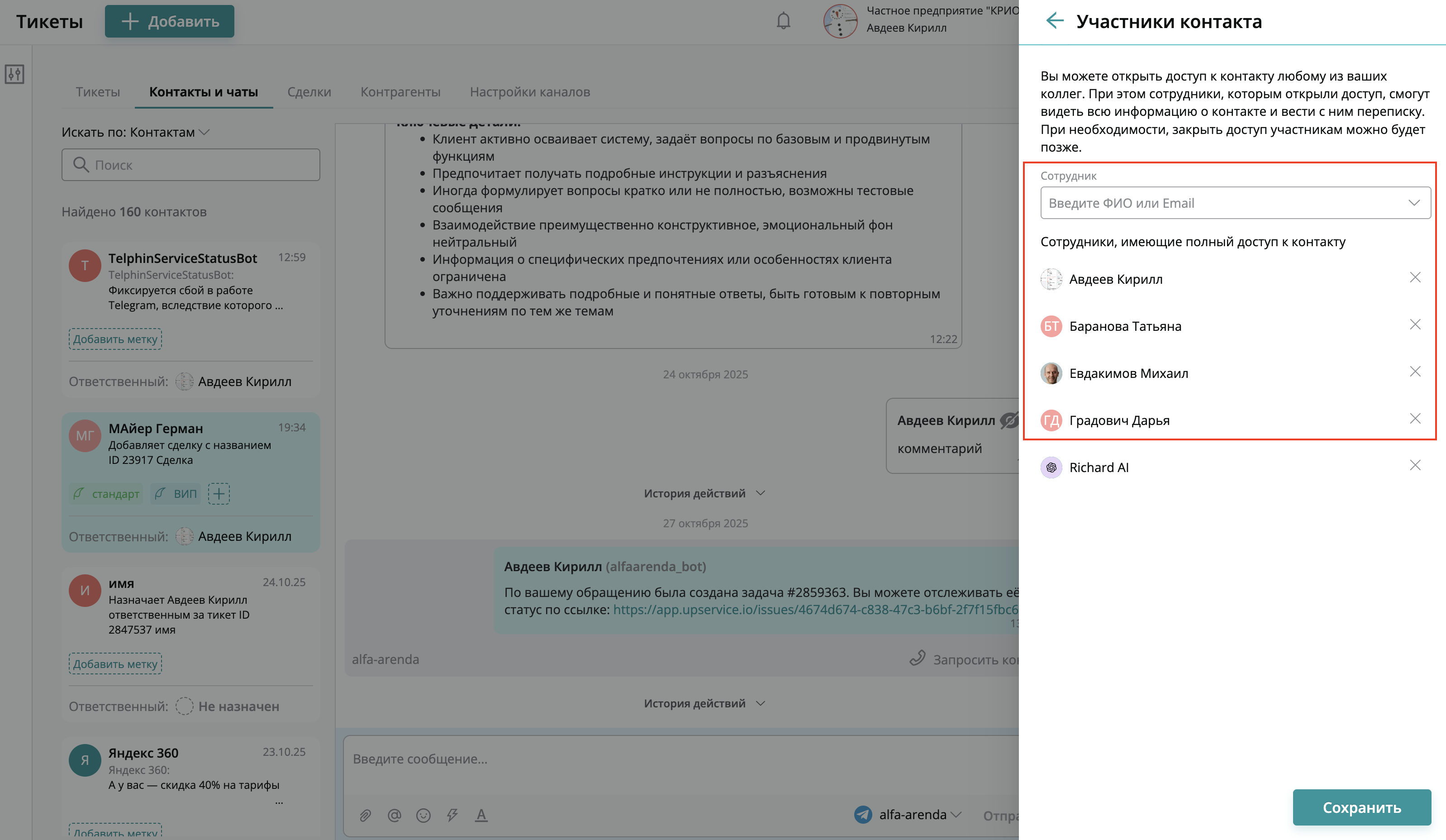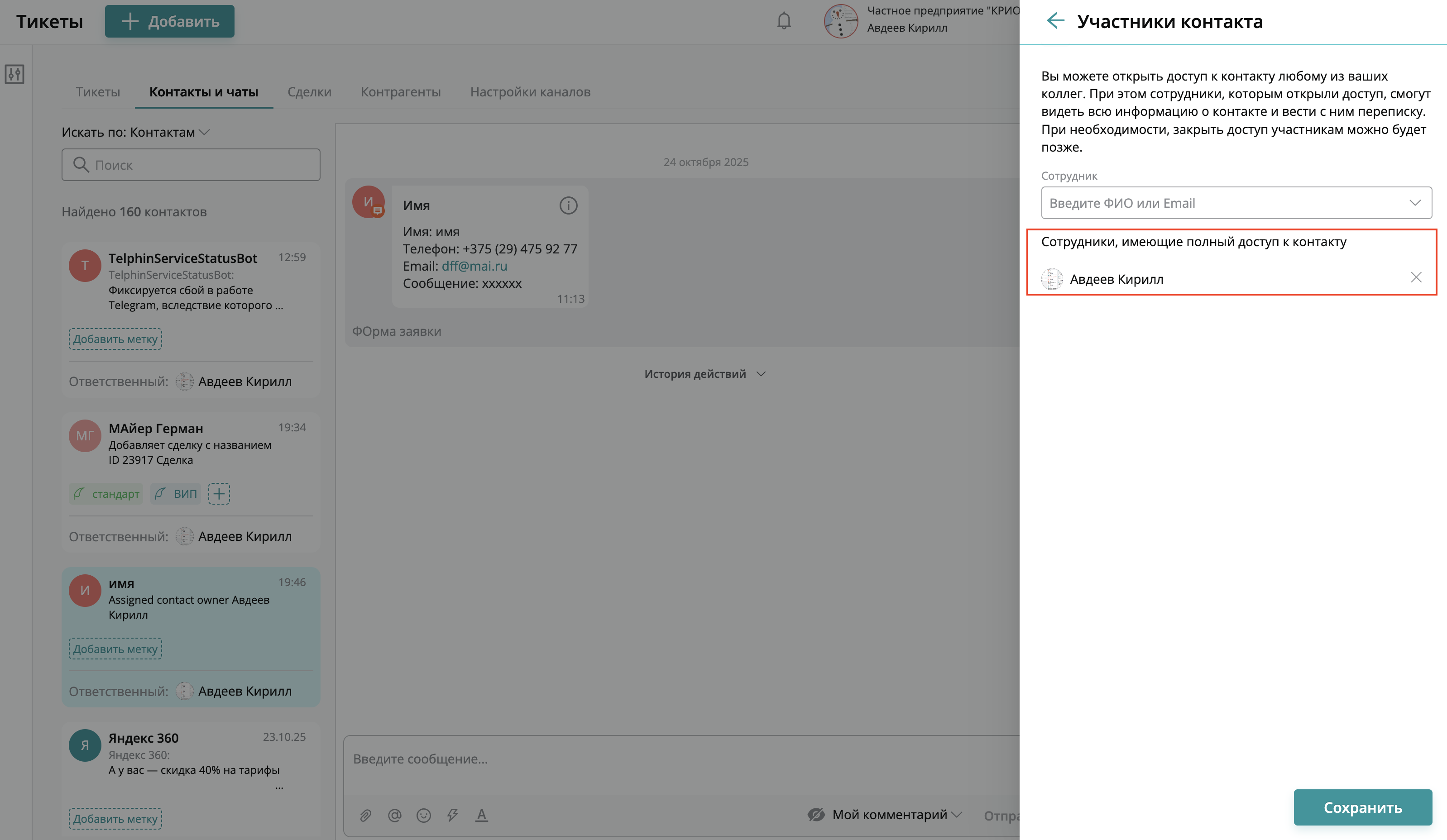 Участники контакта — коллеги, которые смогут вести переписку с клиентом, видеть историю взаимодействия с ним, а также ставить задачи, создавать заказы и закупки, архивировать контакт и объединять его с другим. Участник контакта по правам приравнивается к оператору канала.