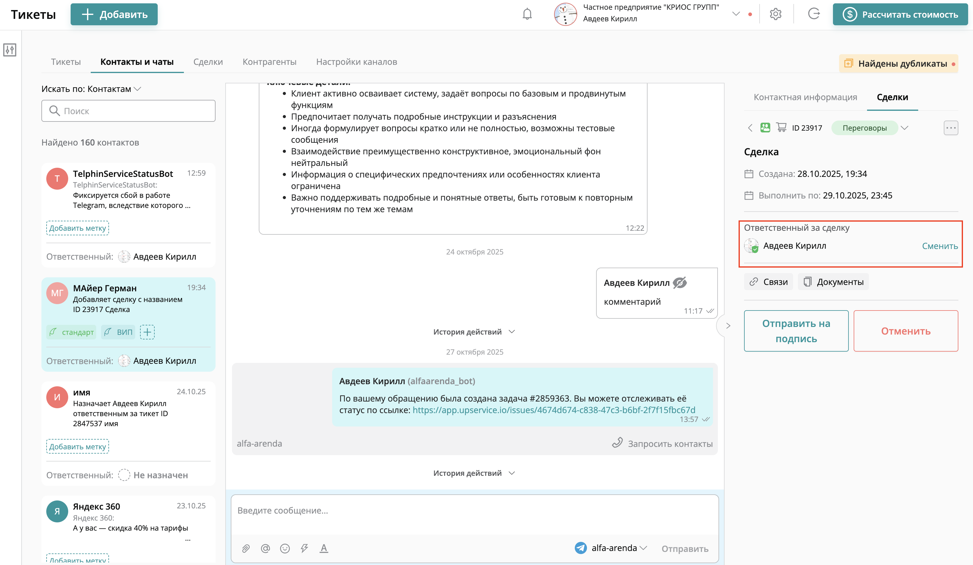 Участники контакта — это сотрудники, которые будут иметь доступ к сделке, видеть все документы по нему, смогут оставлять комментарии и общаться с контактом, добавлять или удалять метки.