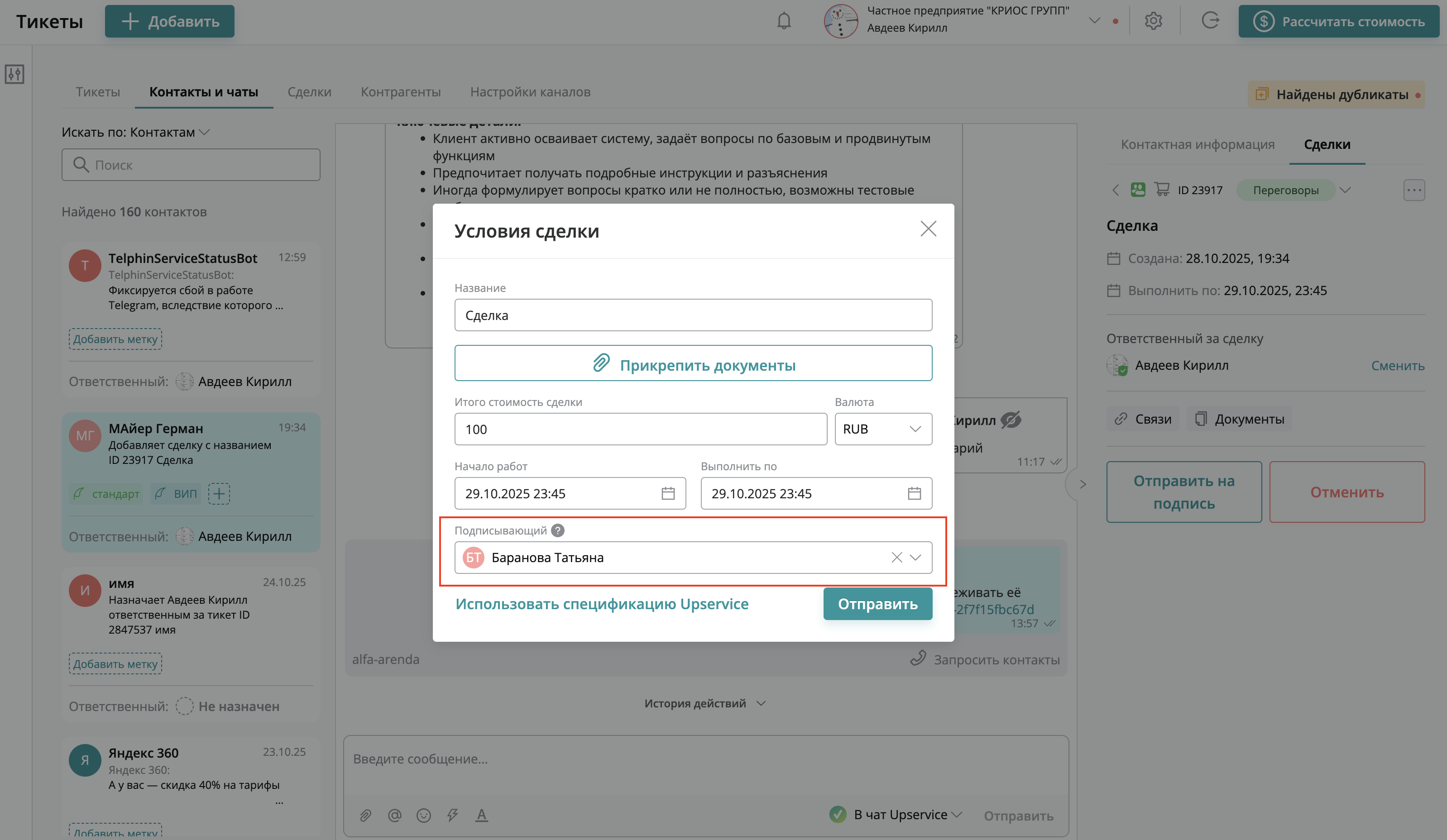 Подписывающий — сотрудник с правом подписи. Добавить нового подписывающего может только руководитель компании на странице раздела «Сделки».
