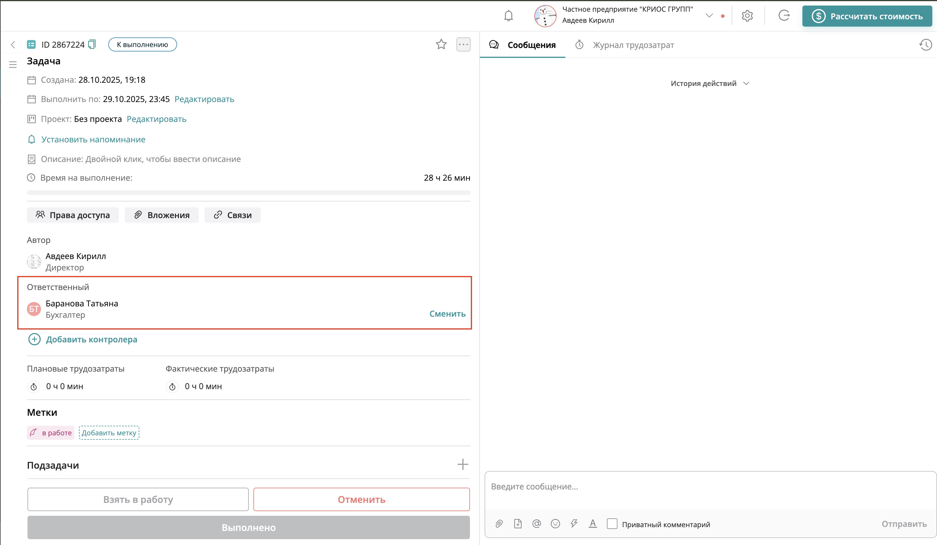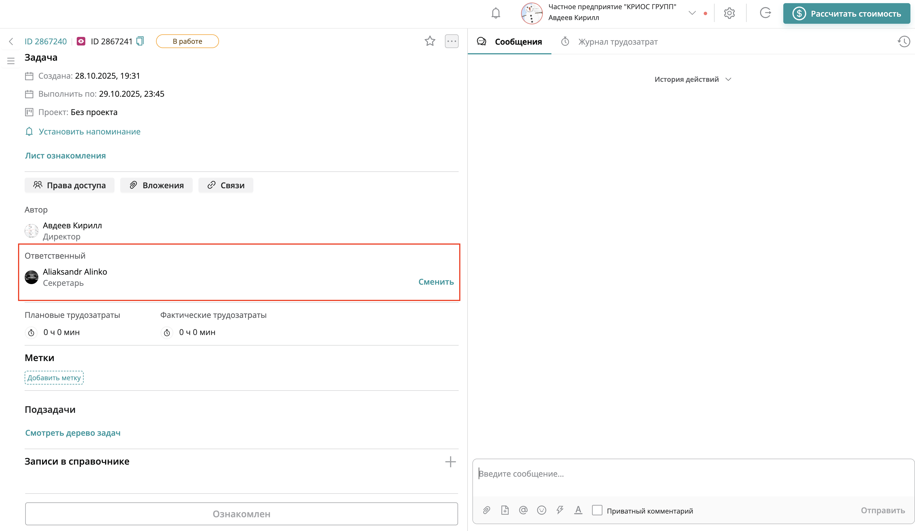 Ответственный — пользователь, который является исполнителем в задаче. У него есть право изменять статус задачи (взять в работу, отправить на проверку, выполнить или отклонить), участвовать в обсуждении условий задачи, добавлять соисполнителей, связи к задаче и назначать контролера, а также обмениваться документами с коллегами и добавлять свои подзадачи.