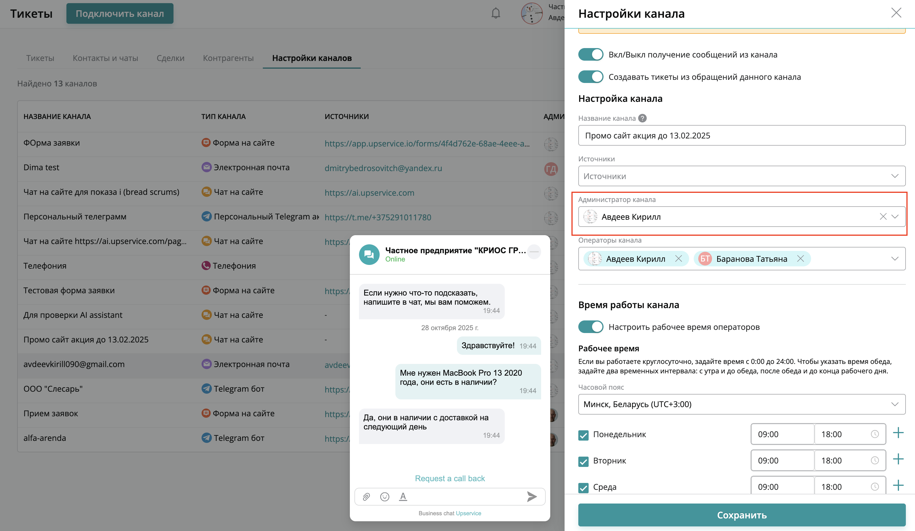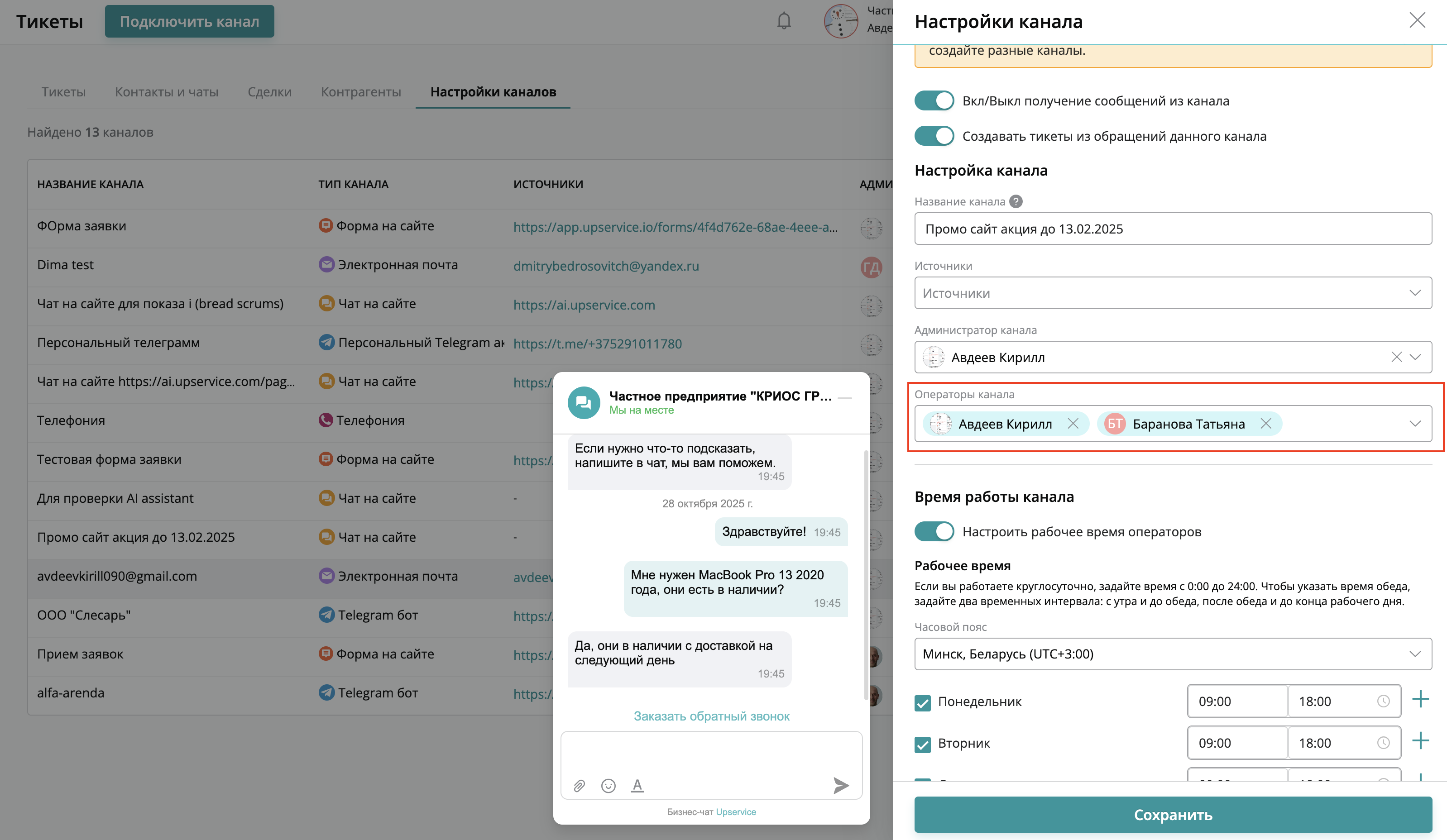 Операторы канала — сотрудники, которые будут общаться с клиентами. Операторы имеют доступ к контактам только из определенного канала.