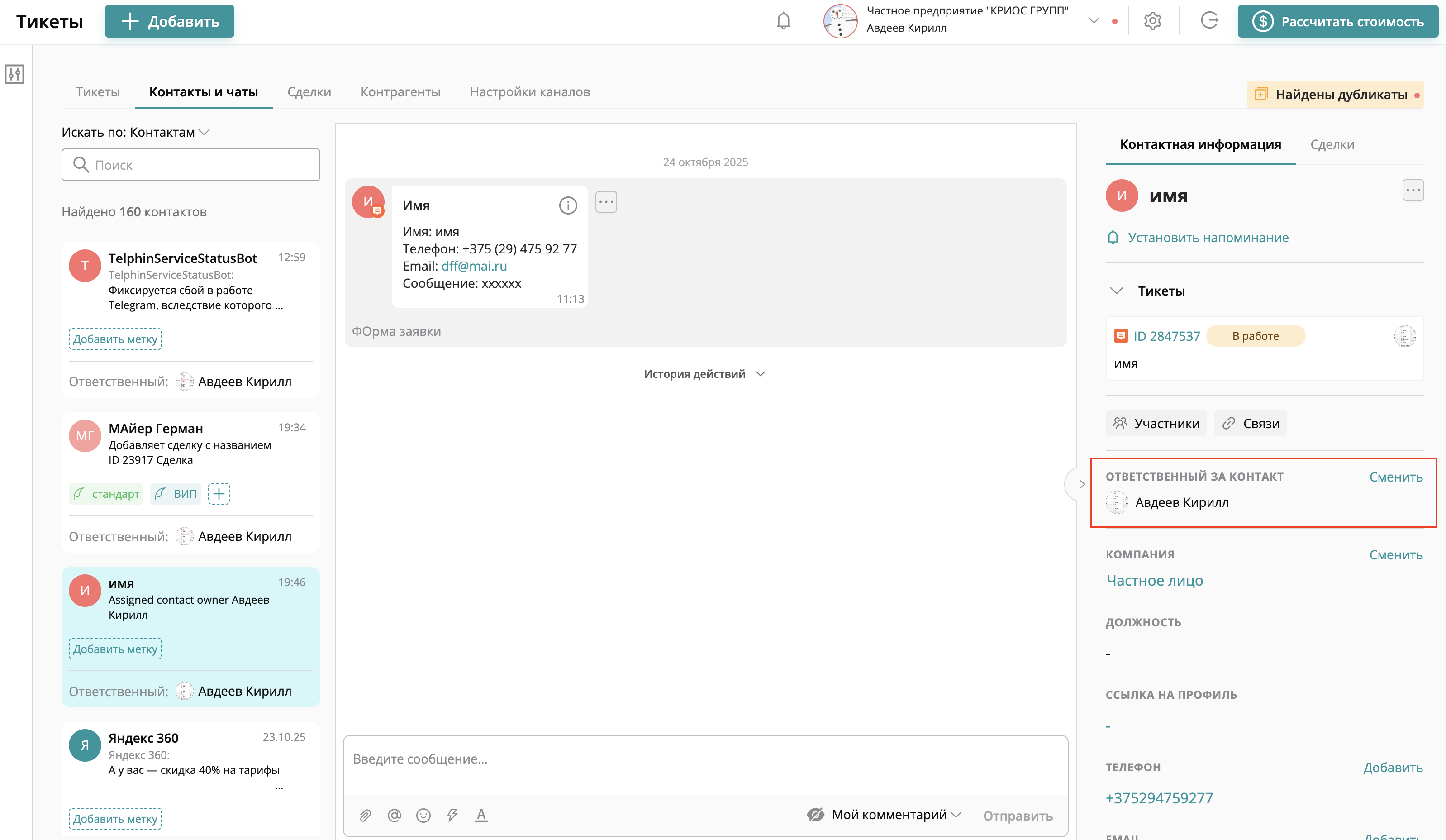 Ответственный за контакт — пользователь, который отвечает за клиента и общение с ним. Только он и пользователи выше по оргструктуре (руководитель подразделения, руководитель компании) имеют право вносить изменения в карточку контакта (изменять телефон, Email, дату рождения, адрес и Компанию контакта).