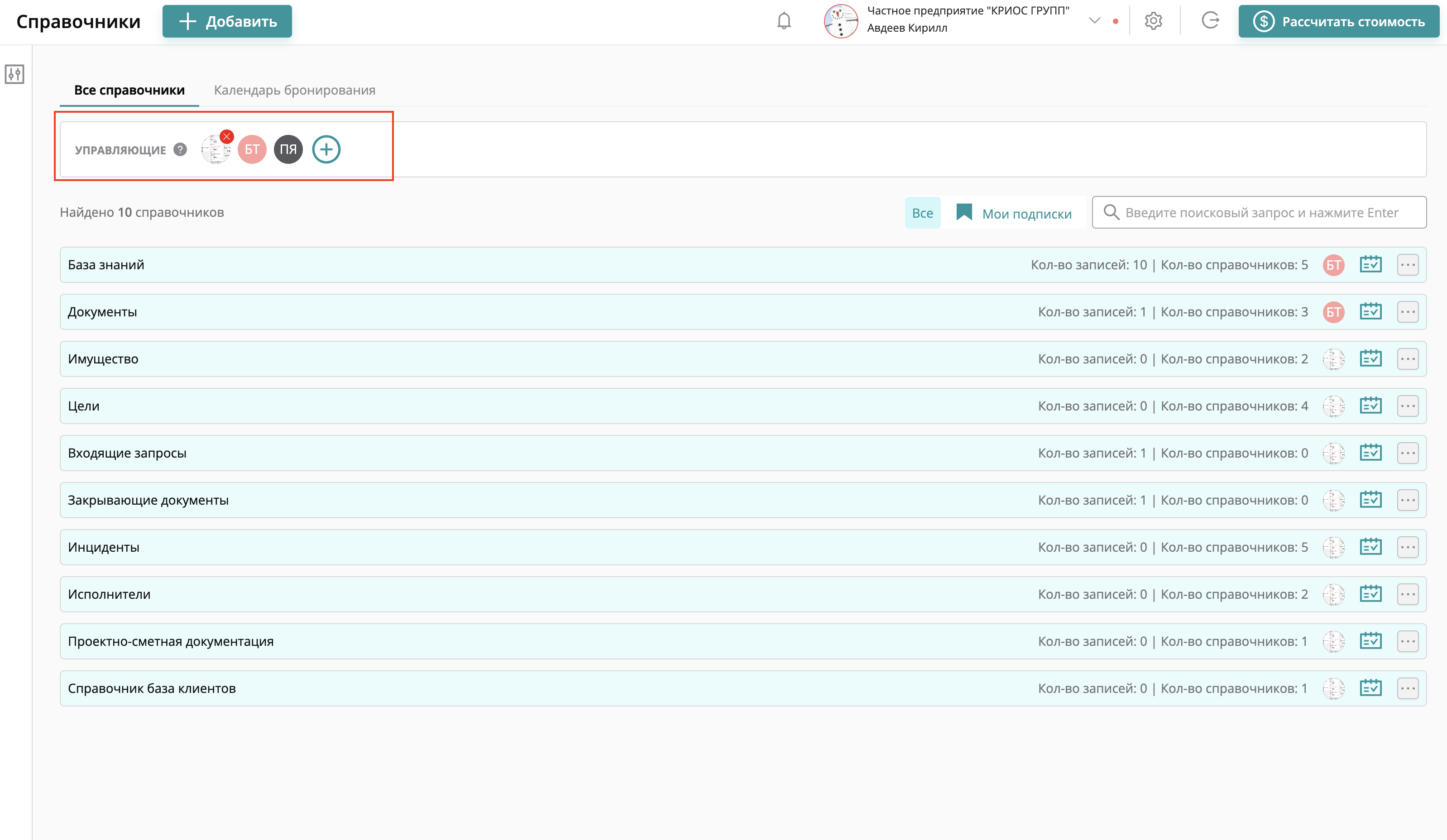 Управляющий справочником — пользователь, который является ответственным за определенные документы, оборудование или имущество. Управляющий может добавлять новые справочники и создавать вложенные, редактировать название, менять управляющего и удалять справочник.