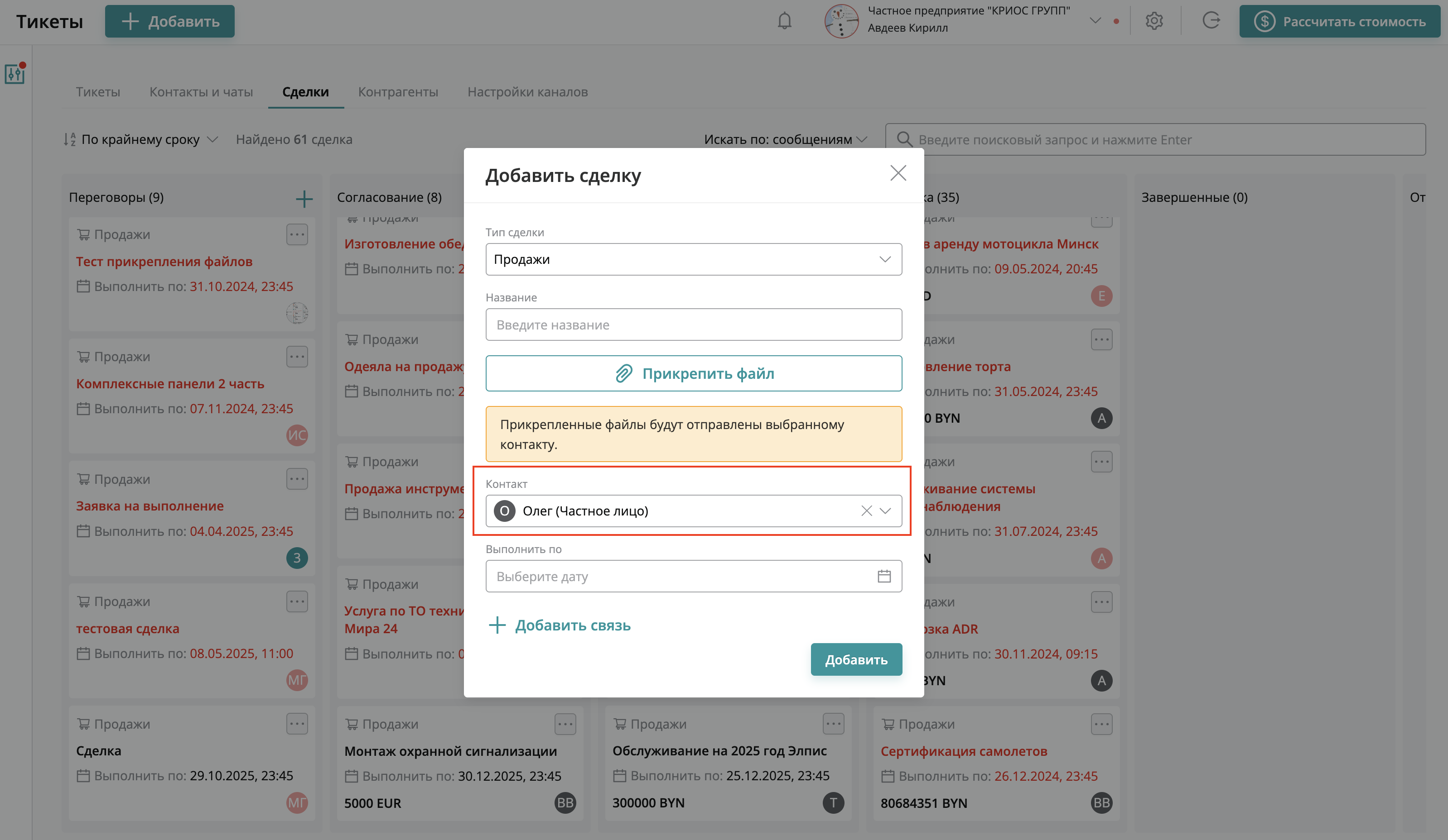 Контрагент (контакт) — ваш клиент, юридическое или физическое лицо, с которым вы совершаете сделку. Без указания контрагента ответственный не сможет создать Заказ.