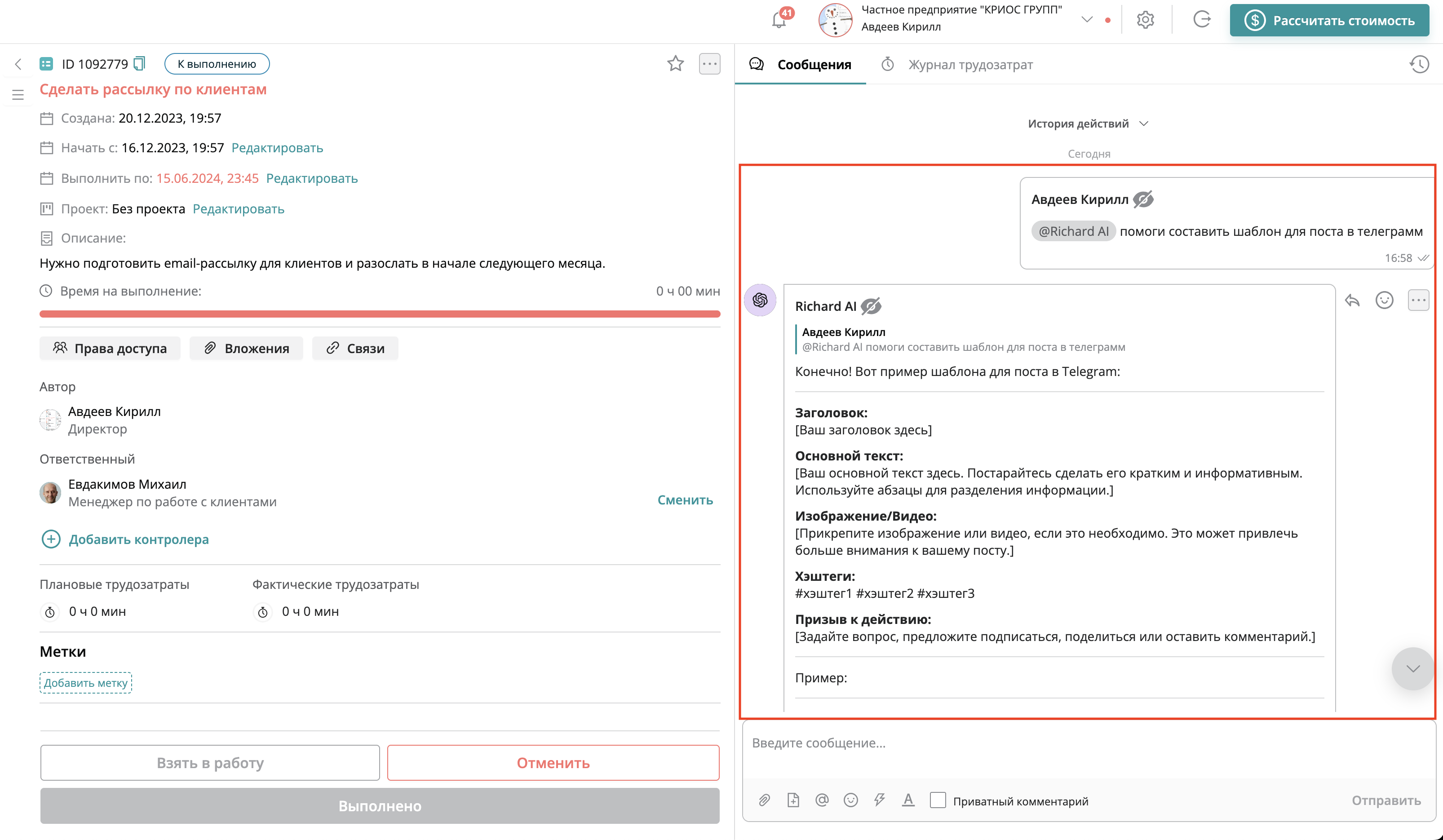 Вы можете обратиться к AI-ассистенту из любого раздела системы, где есть возможность писать сообщения / комментарии. Например: из задачи, закупки, диалога с клиентом или прямо из ленты уведомлений.