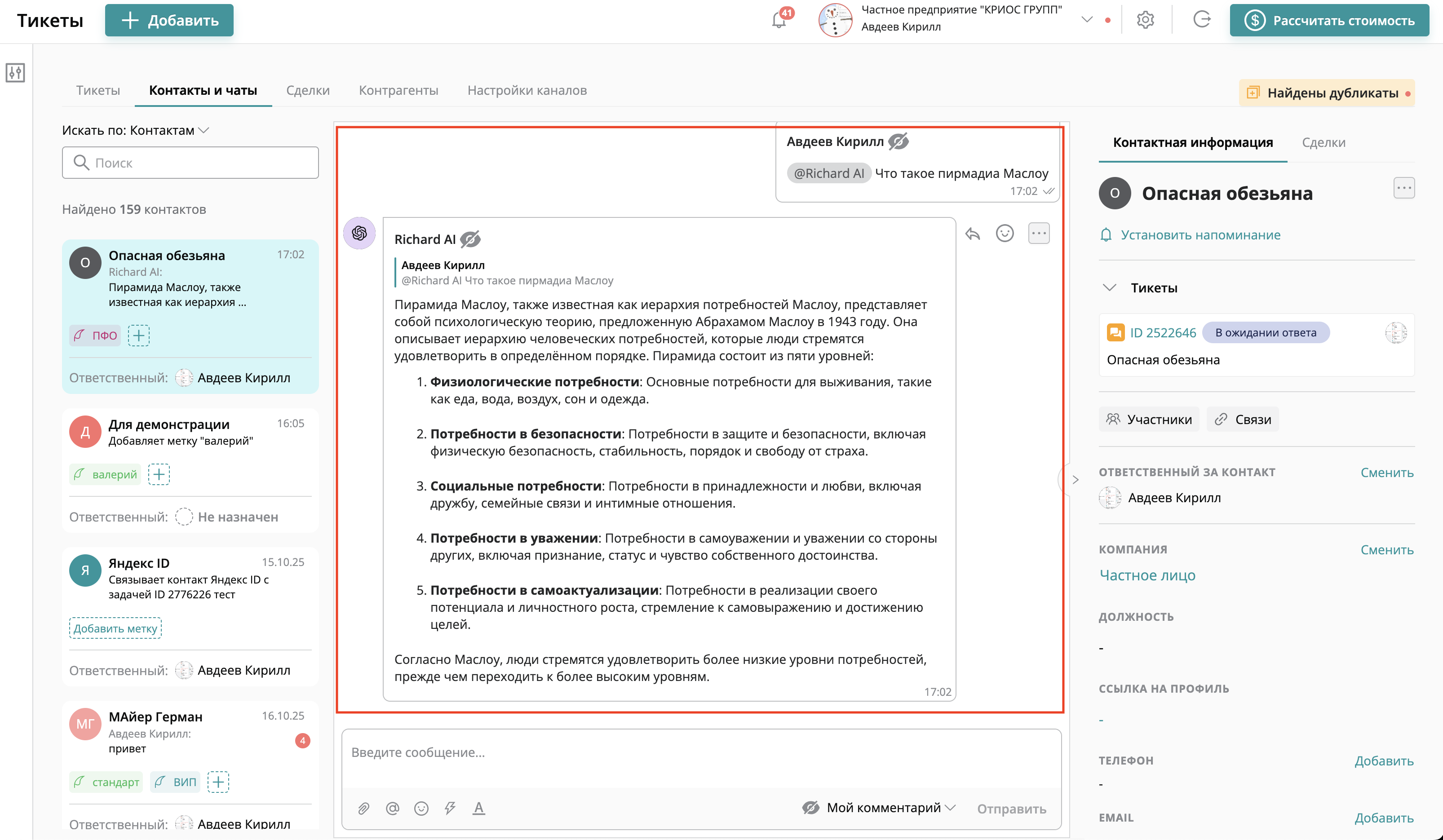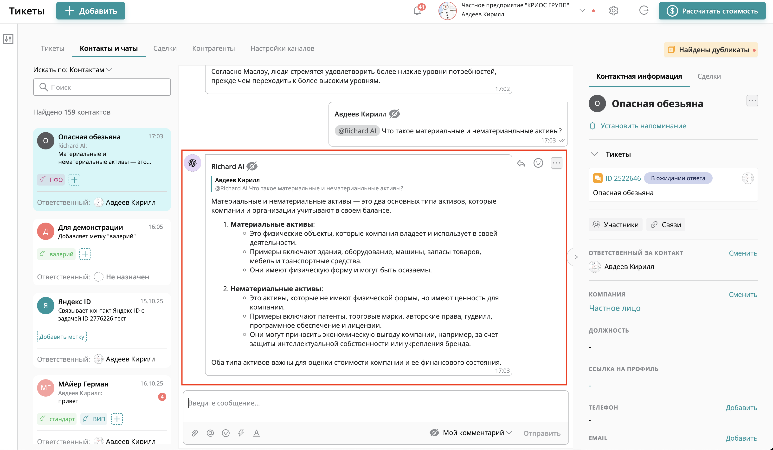 Задавайте Ричарду любые вопросы, попросите составить шаблоны ответов, написать новость о компании или объяснить сложную тему понятным языком. Примеры запросов: «Объясни клиенту, как оформить заказ на сайте», «Что такое омниканальность», «Напиши пост в Telegram на тему…» и т.д.