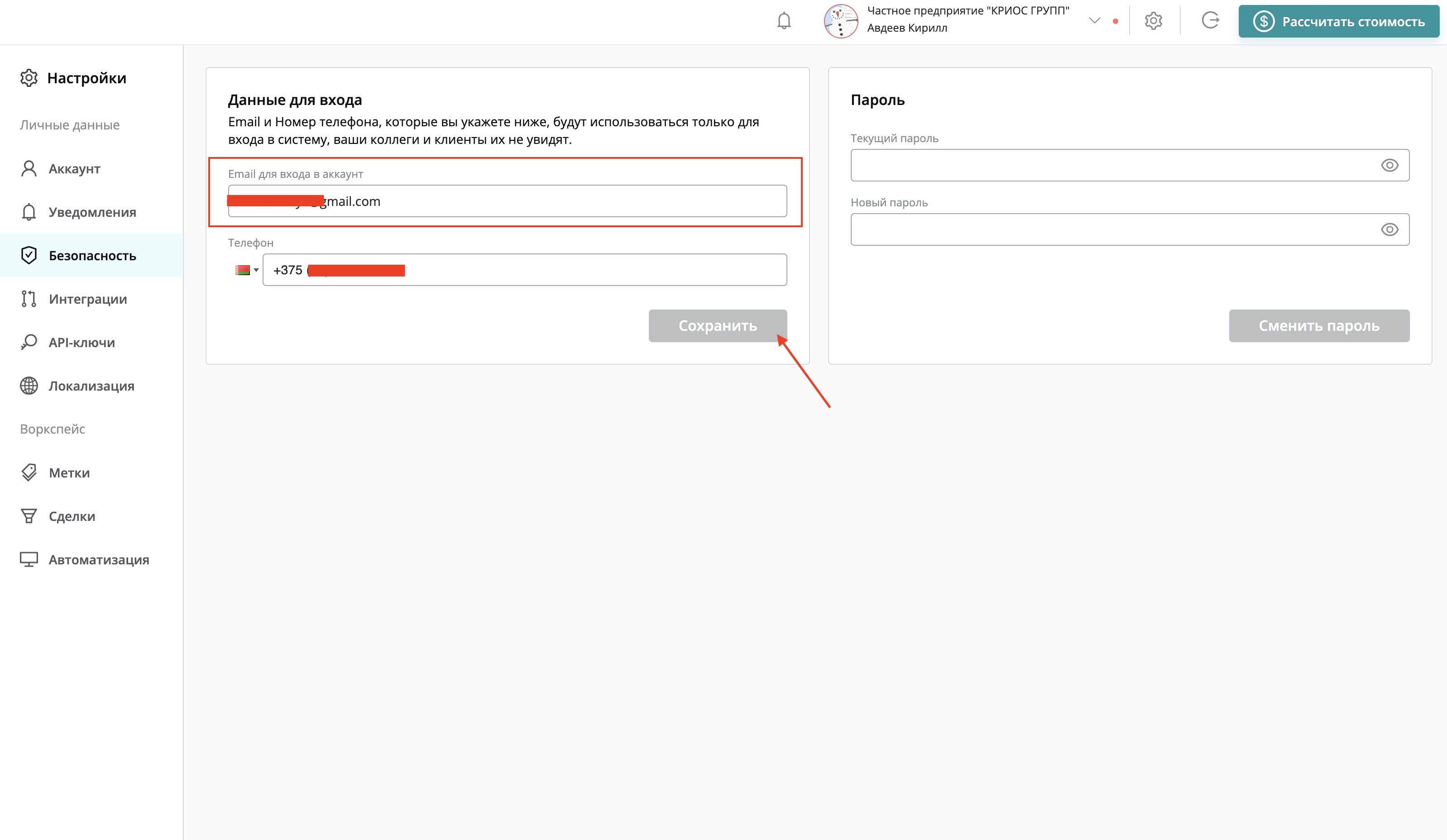 Измените Email для входа в аккаунт и нажмите «Сохранить»: