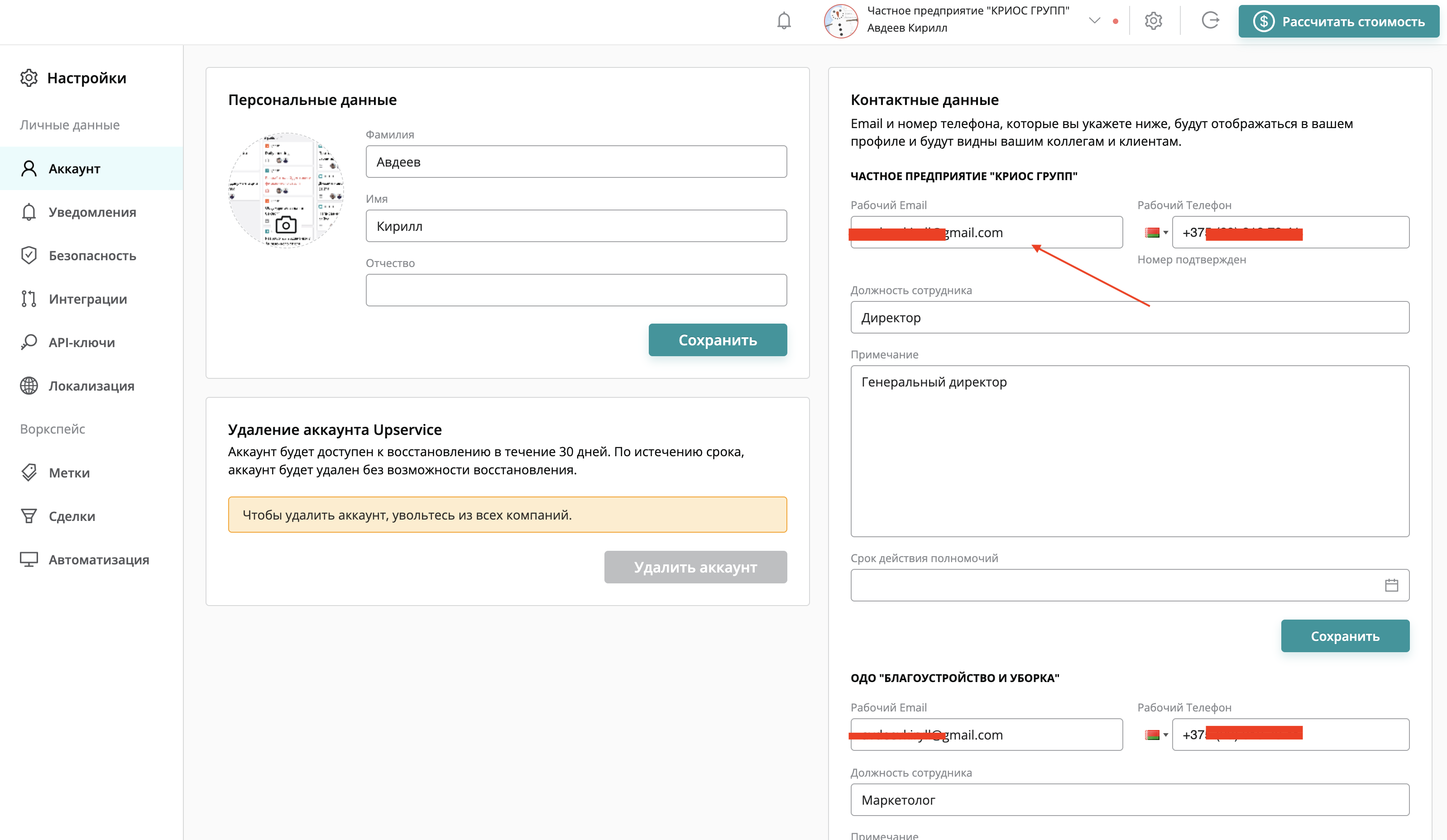 В системе Upservice у каждого сотрудника используются две разные почты: