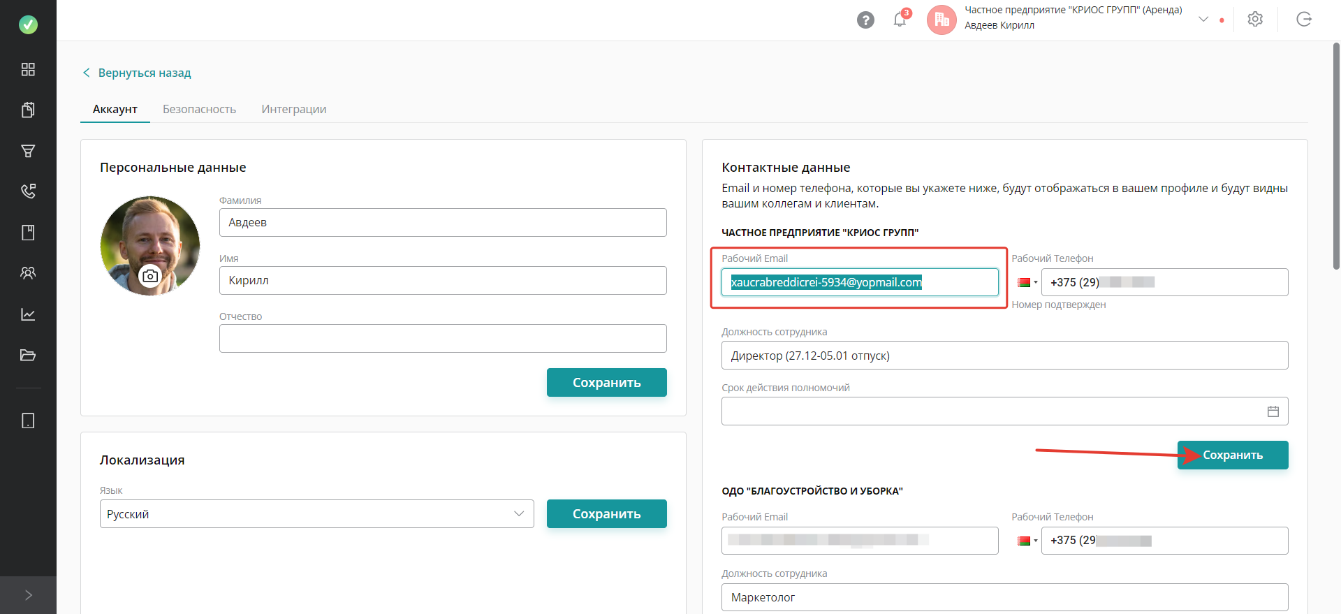 В поле «Рабочий Email» добавьте новую почту и нажмите «Сохранить»: