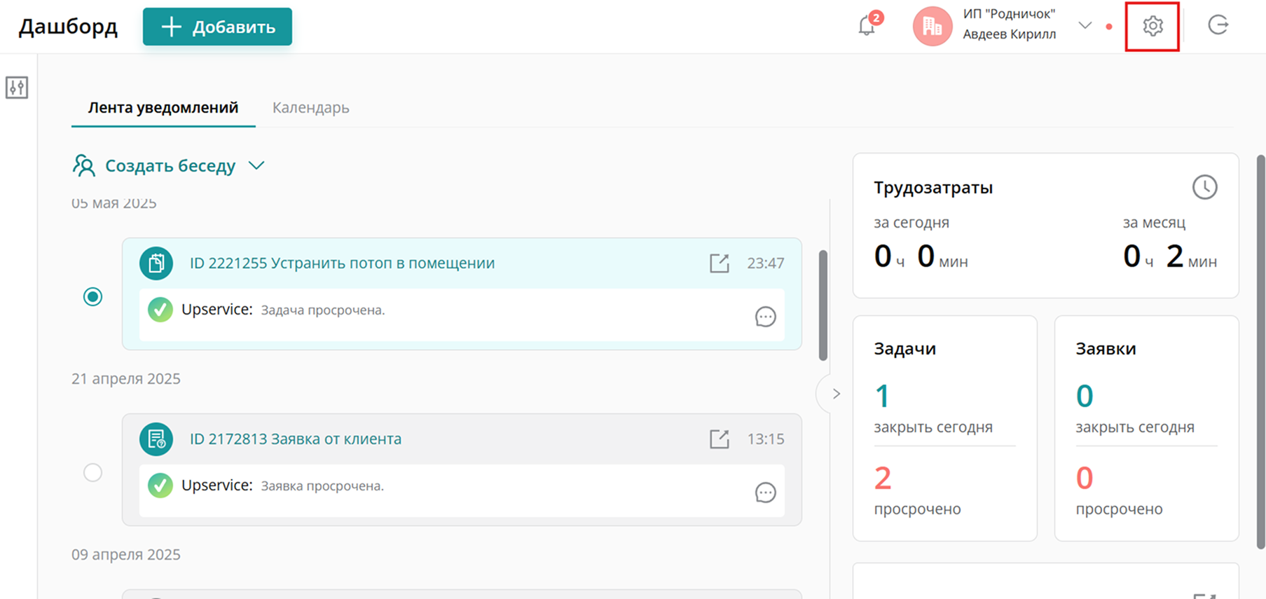Чтобы перейти в настройки аккаунта вам достаточно нажать на значок шестеренки в правом верхнем углу рядом с названием вашей компании: