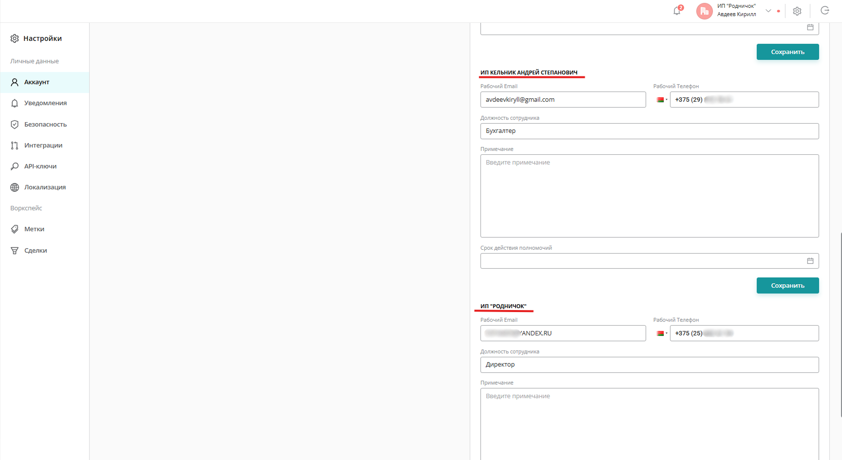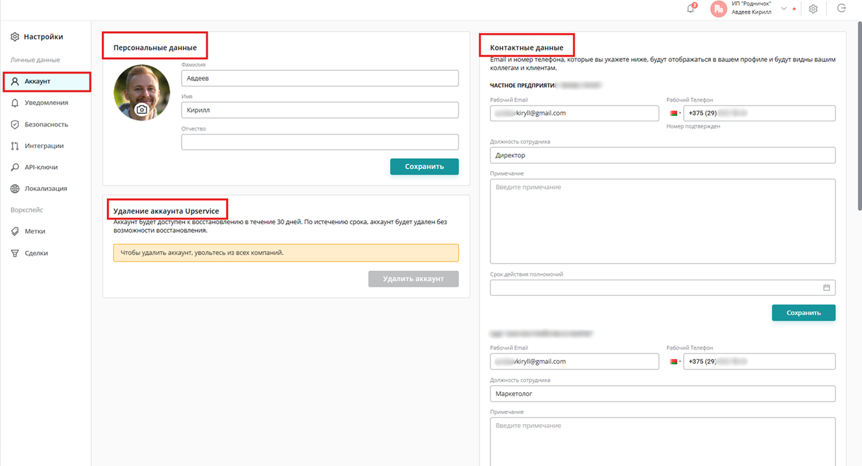 Также в данном пространстве вы можете изменить Контактные данные для других рабочих пространств, если они у вас имеются в системе: