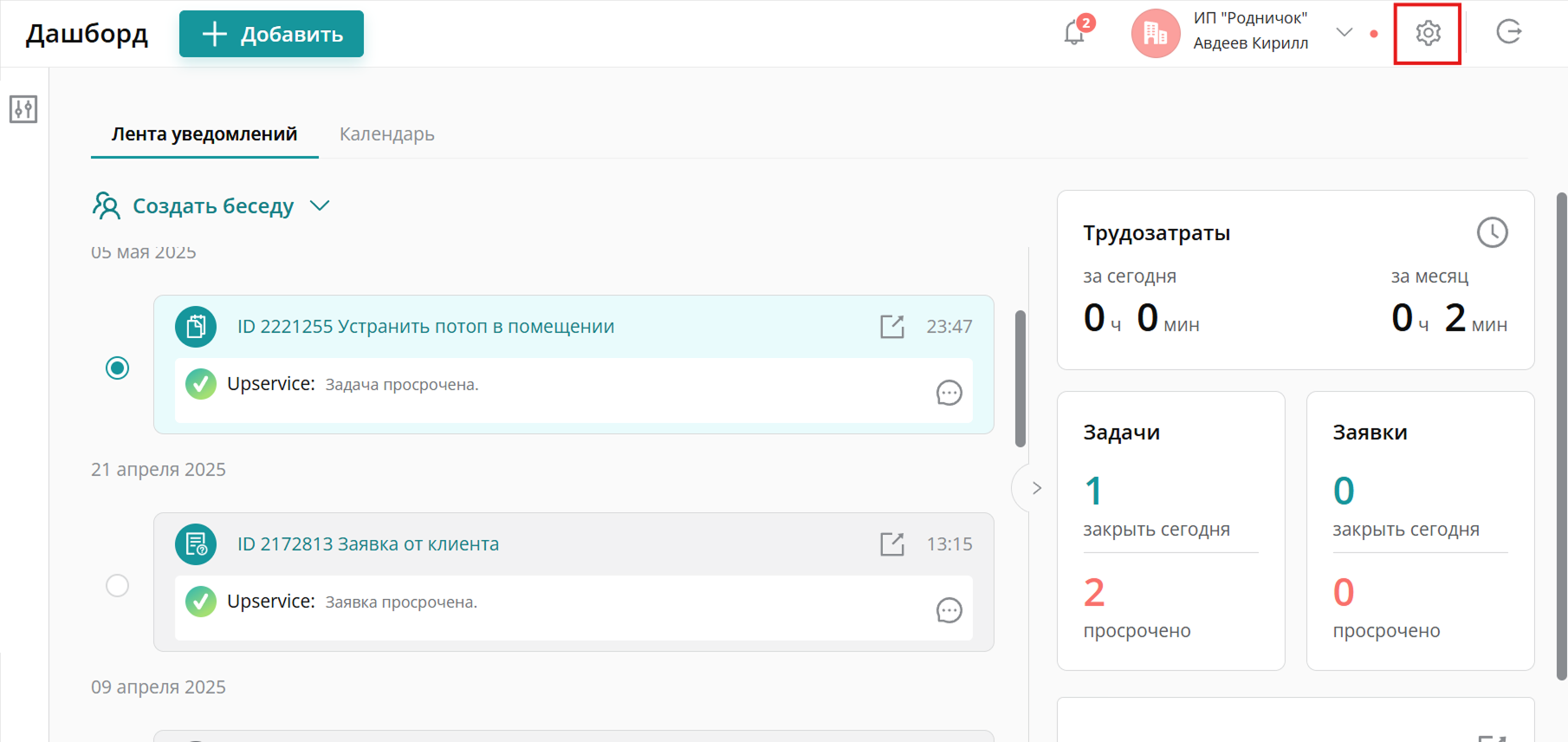 Чтобы перейти в настройки уведомлений вам достаточно нажать на значок шестеренки в правом верхнем углу рядом с названием вашей компании: