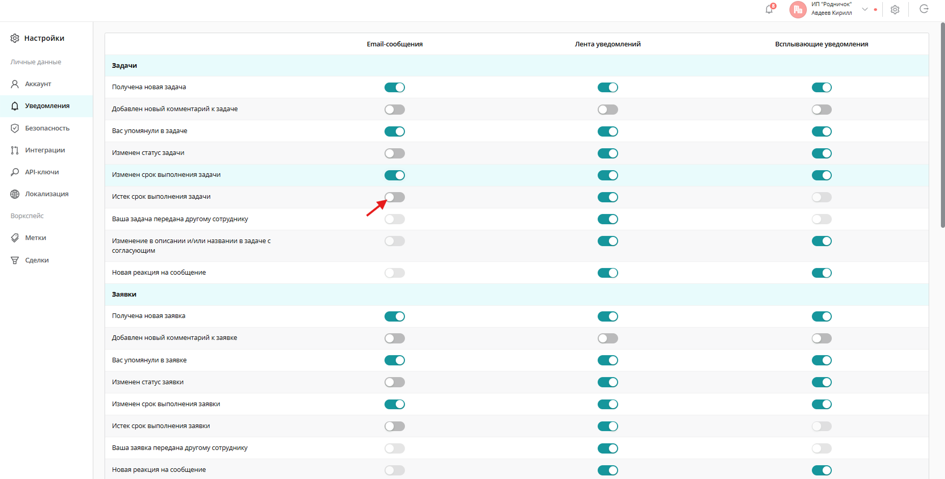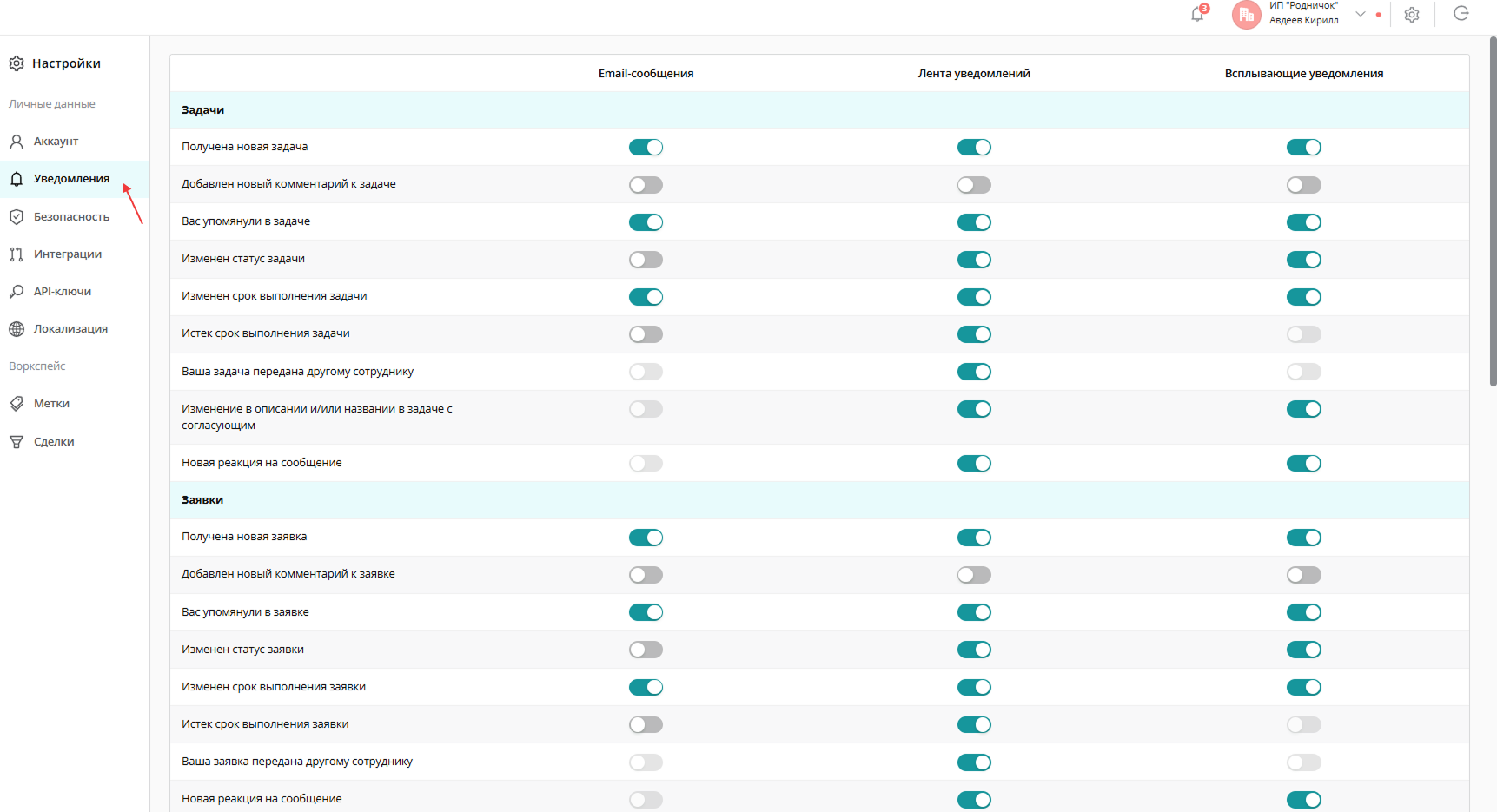 В разделе "Настройки уведомлений" вы можете самостоятельно выбрать, какие уведомления хотите получать в разных разделах системы. Это позволяет настроить систему под себя — отключить лишние уведомления и оставить только те, которые действительно важны. Таким образом, вы будете получать только актуальную и полезную информацию, не отвлекаясь на лишнее.