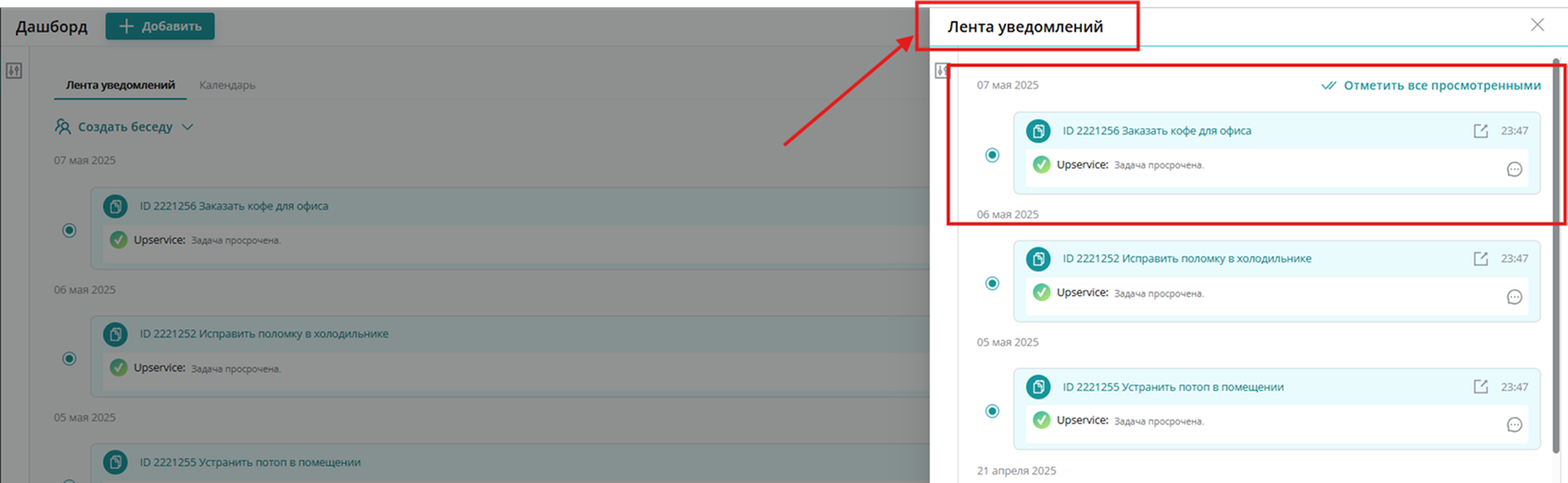 - Лента уведомлений: данные уведомления будут приходить в ваши уведомления в самом сервисе в колокольчике;