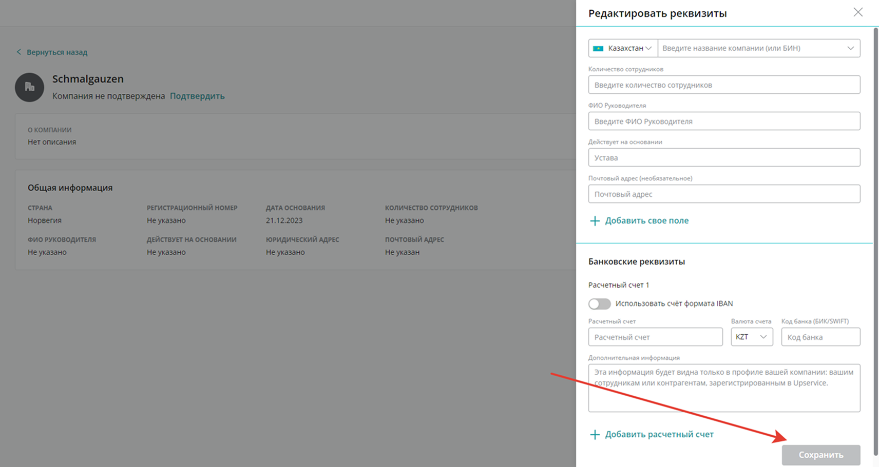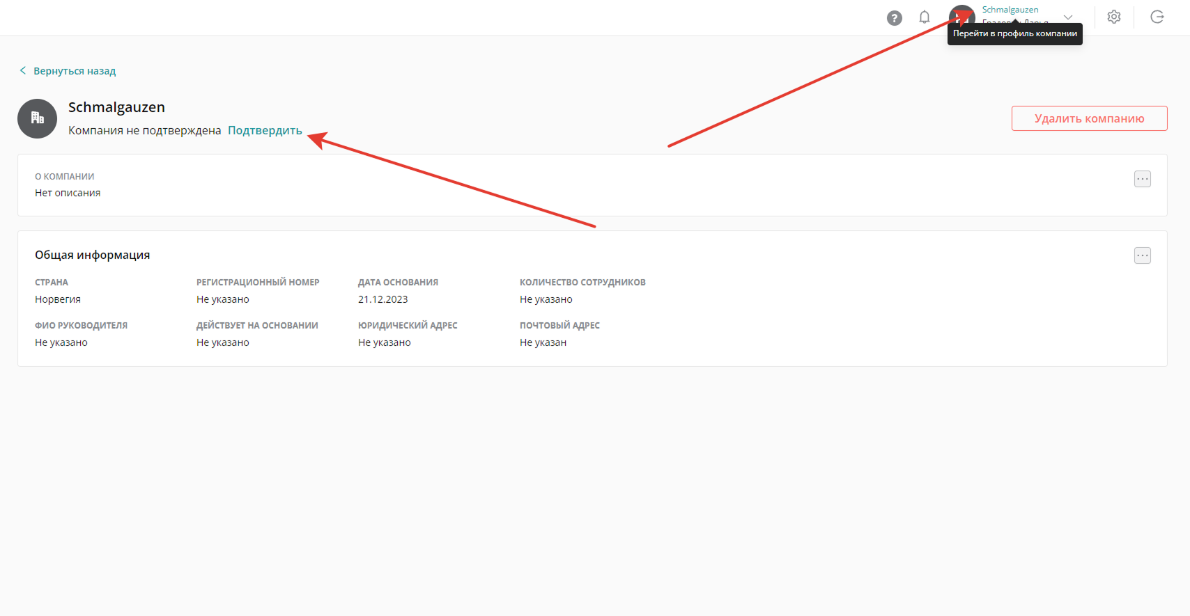 Для этого нажмите на название компании в правом верхнем углу и перейдите в профиль компании. Нажмите на ссылку «Подтвердить» и заполните всю необходимую информацию.