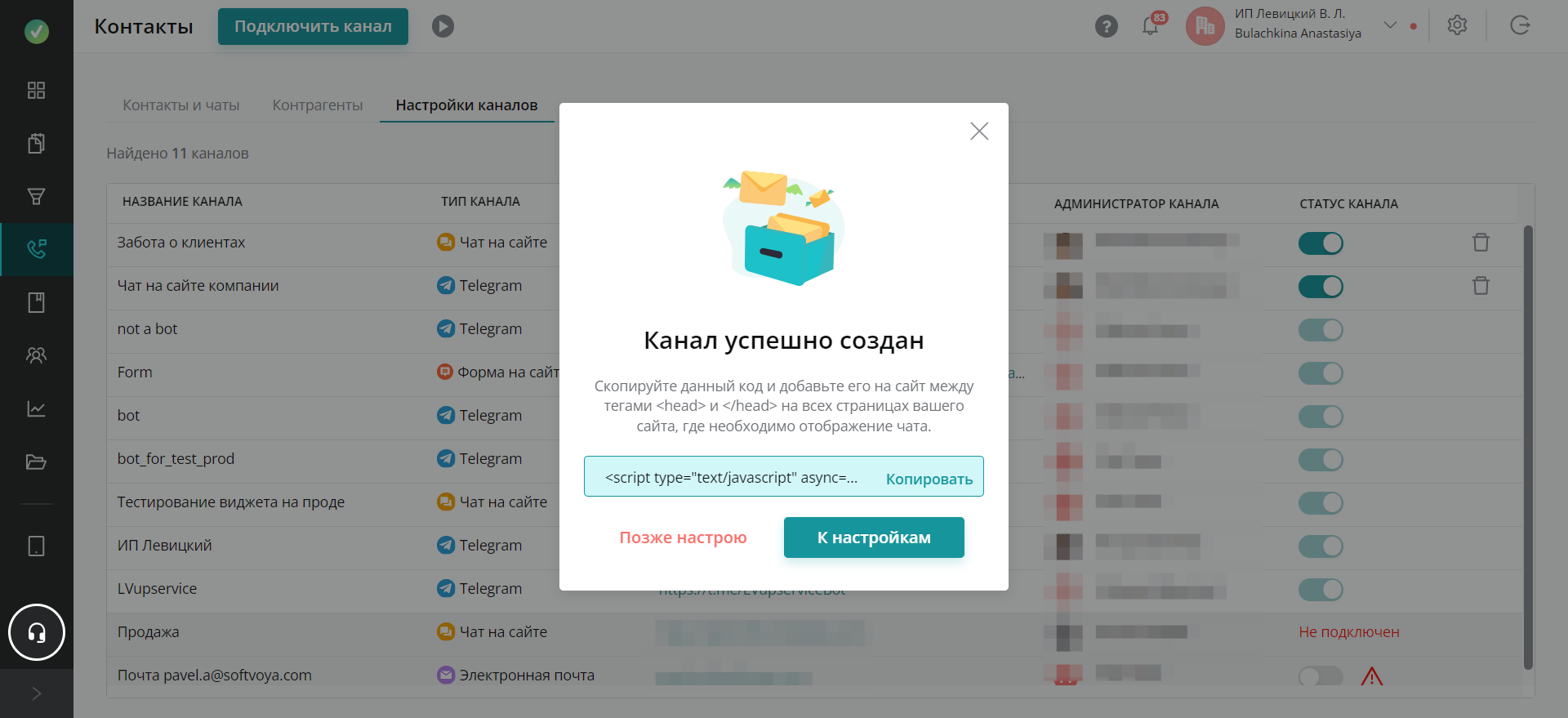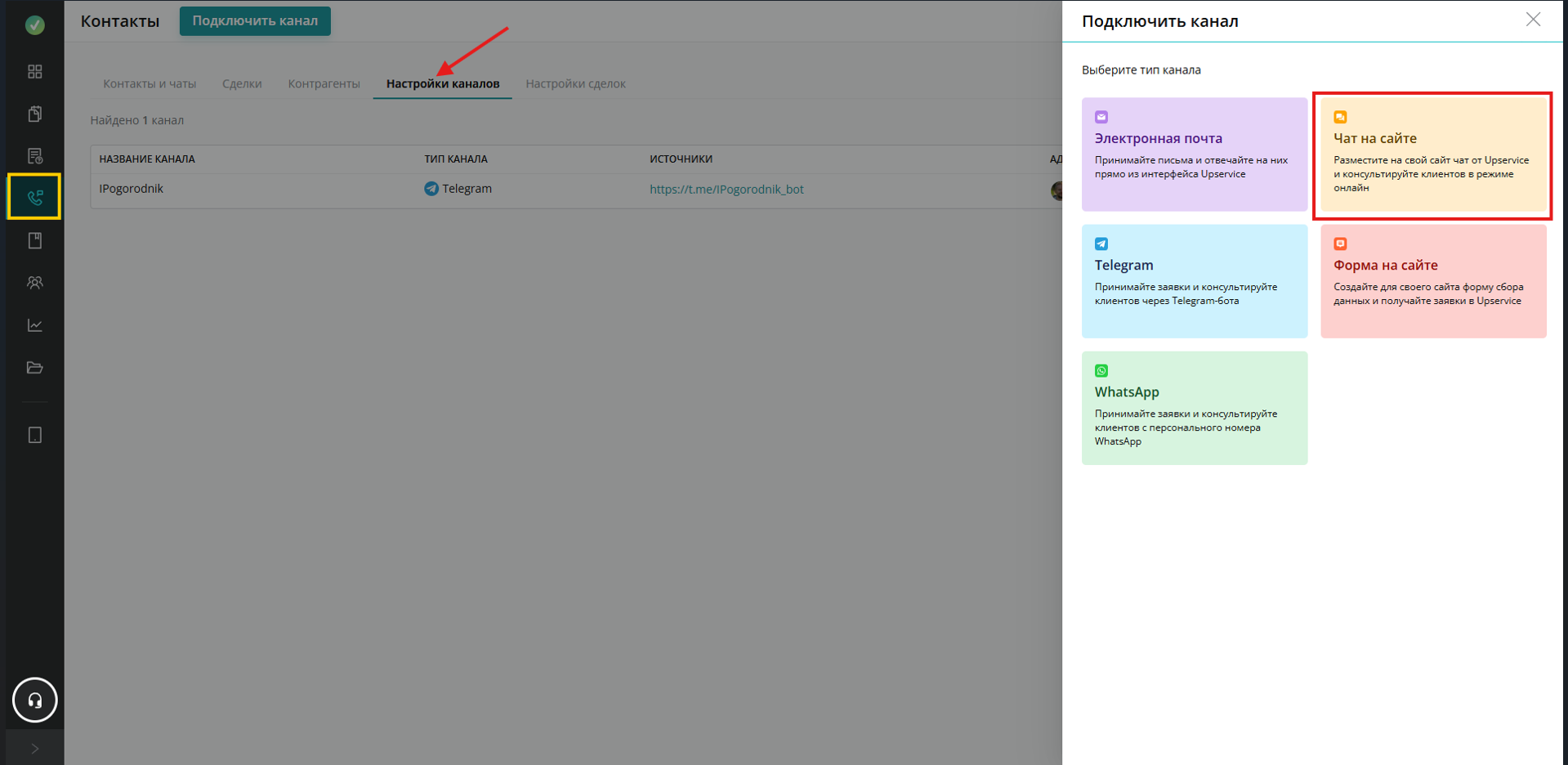 Чтобы подключить (создать) онлайн-чат для вашего сайта, перейдите в раздел «Контакты», перейдите на вкладку «Настройки каналов» и нажмите на кнопку «Подключить канал»: