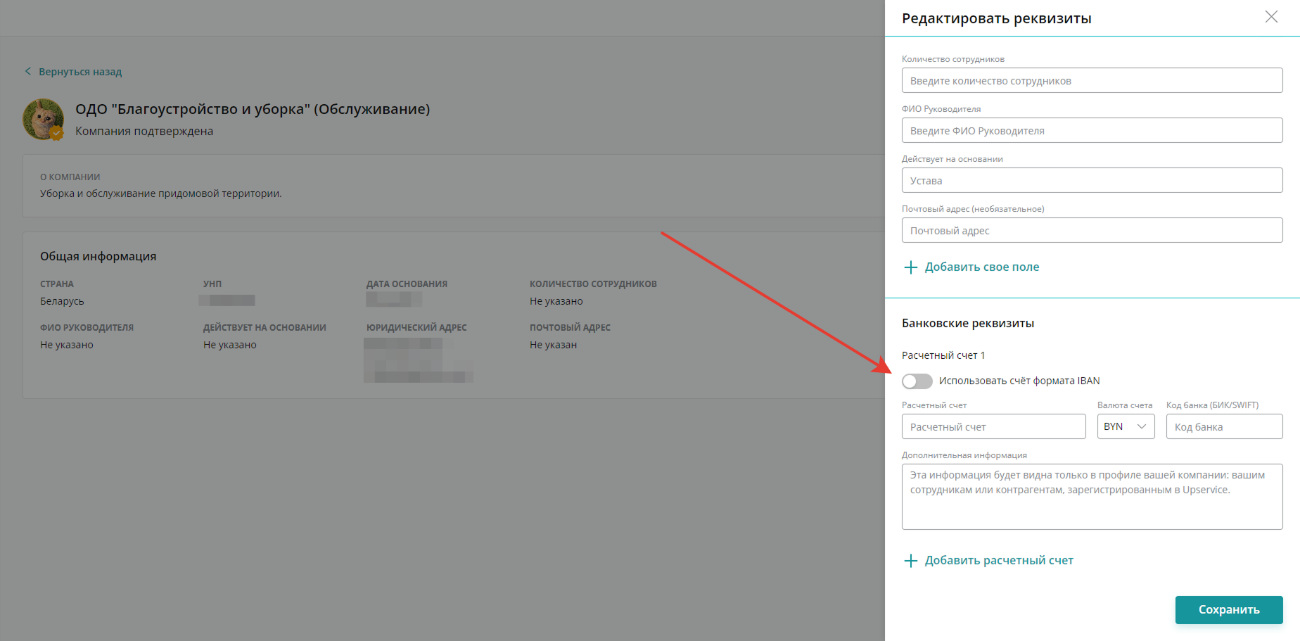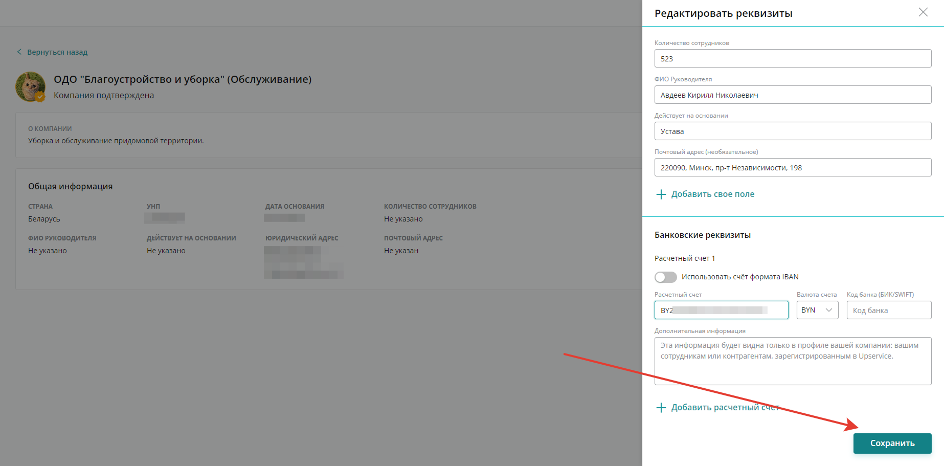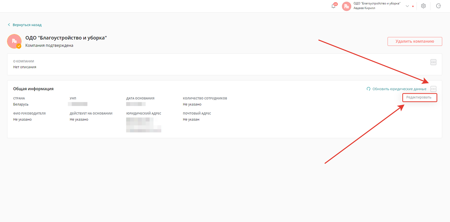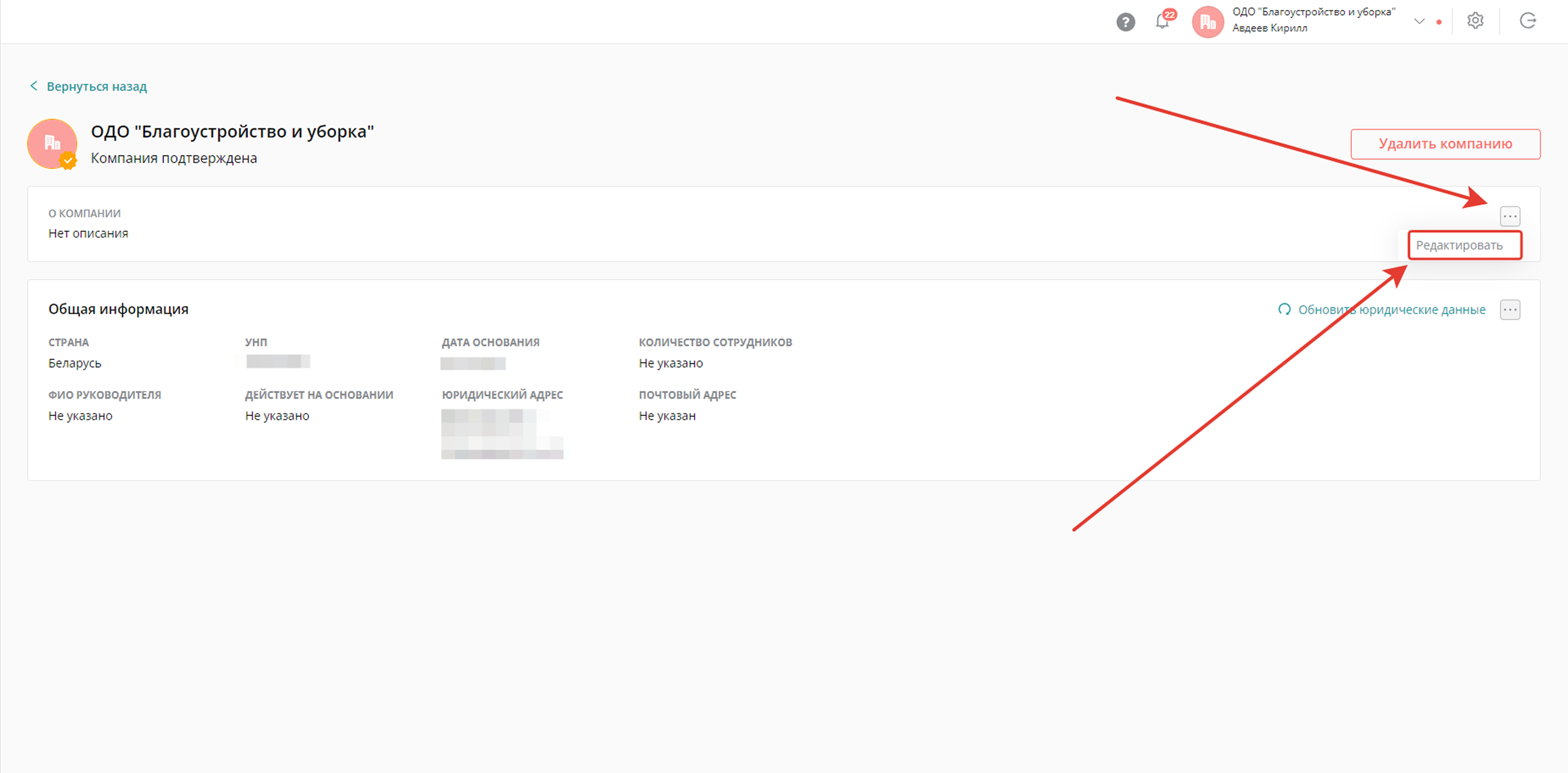 Upservice позволяет редактировать только часть информации в профиле компании. Это обусловлено тем, что для подтверждения компании мы используем информацию из открытых источников (государственные реестры юридических лиц и т.п.) и некоторые поля заполняются автоматически.
