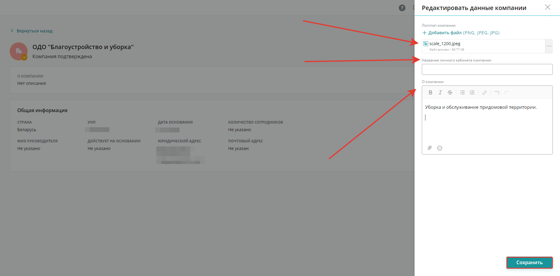 Здесь вы можете добавить или изменить логотип компании, описание, название личного кабинета, которые будут видеть все сотрудники компании. В конце не забудьте нажать кнопку «Сохранить», чтобы внесенные изменения вступили в силу: