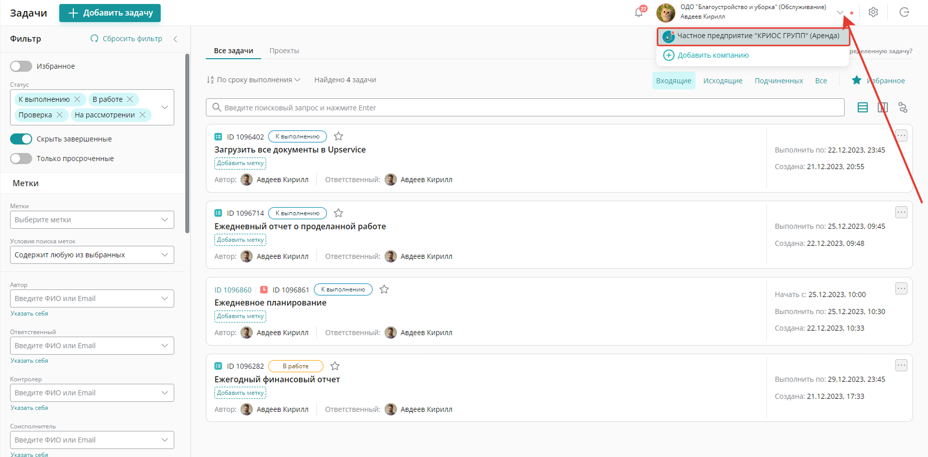 Редактирование информации о компании доступно из любого раздела Upservice. Для перехода на страницу компании нажмите на ее название в правом верхнем углу: