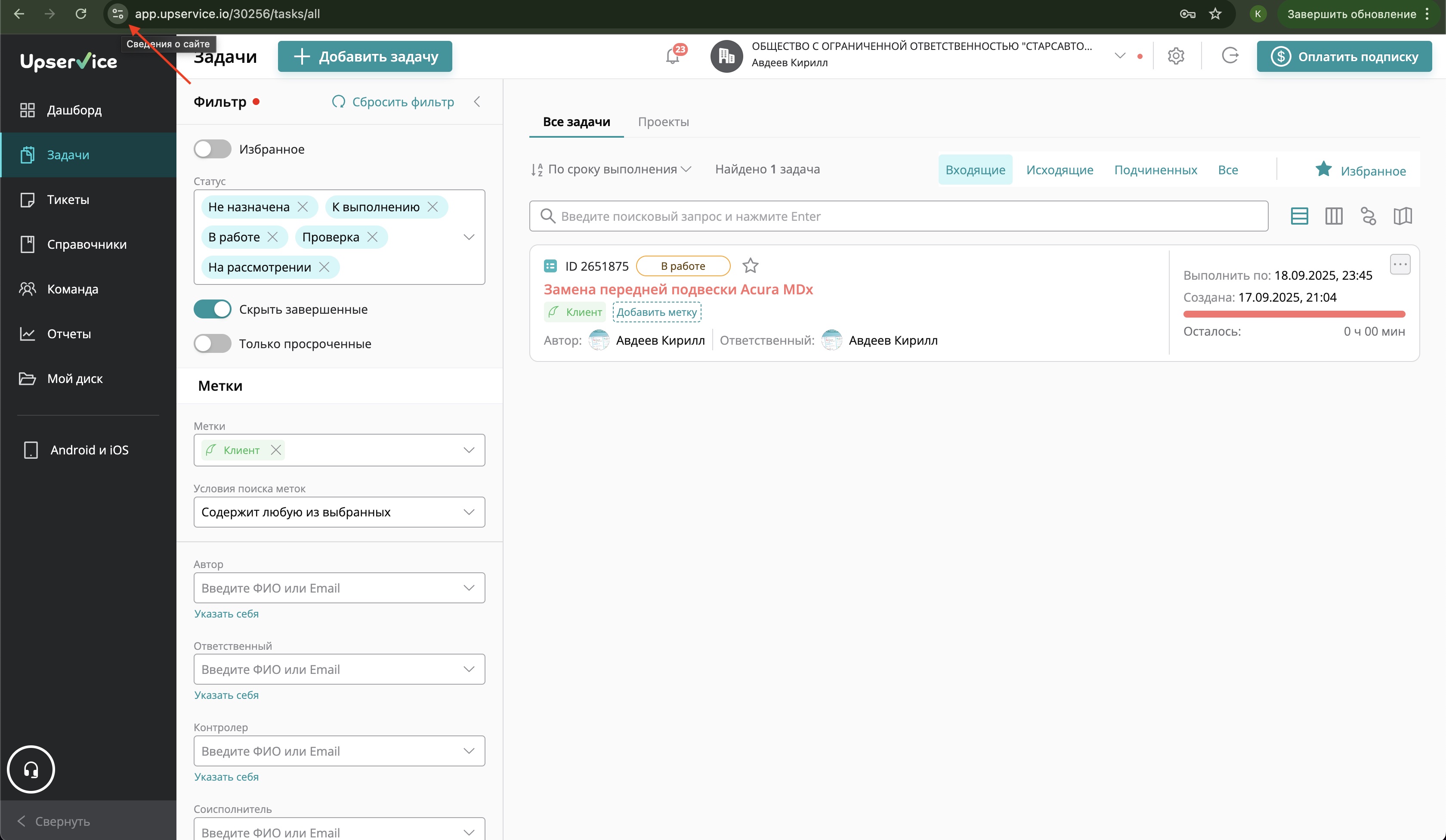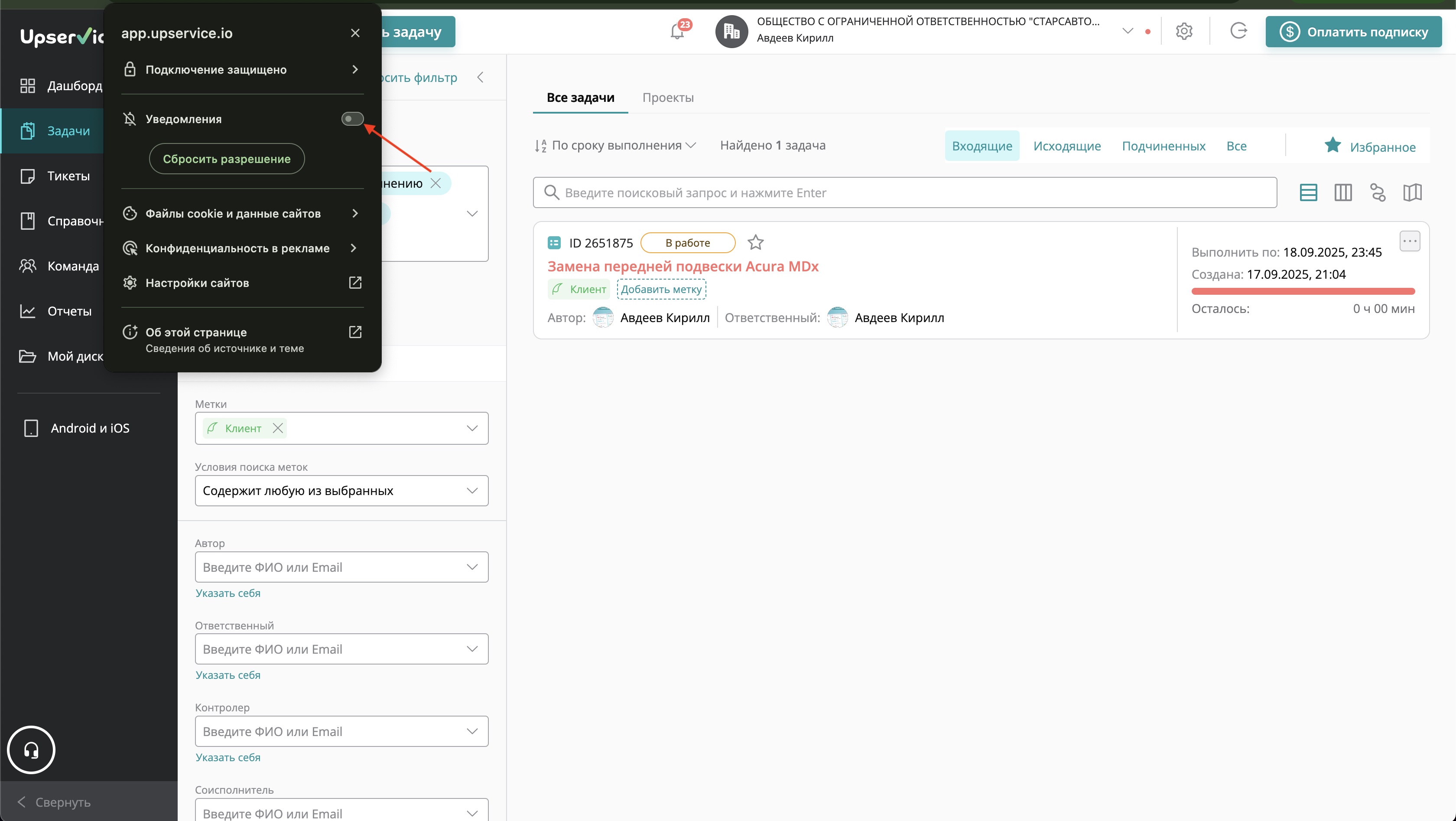 Вы не пропустите рабочие события в Upservice, благодаря Push-уведомлениям (всплывающие окошки) на вашем компьютере. Пришла новая заявка от клиента, поступило обращение в компанию или появился новый комментарий в задаче — вы сможете оперативно реагировать.