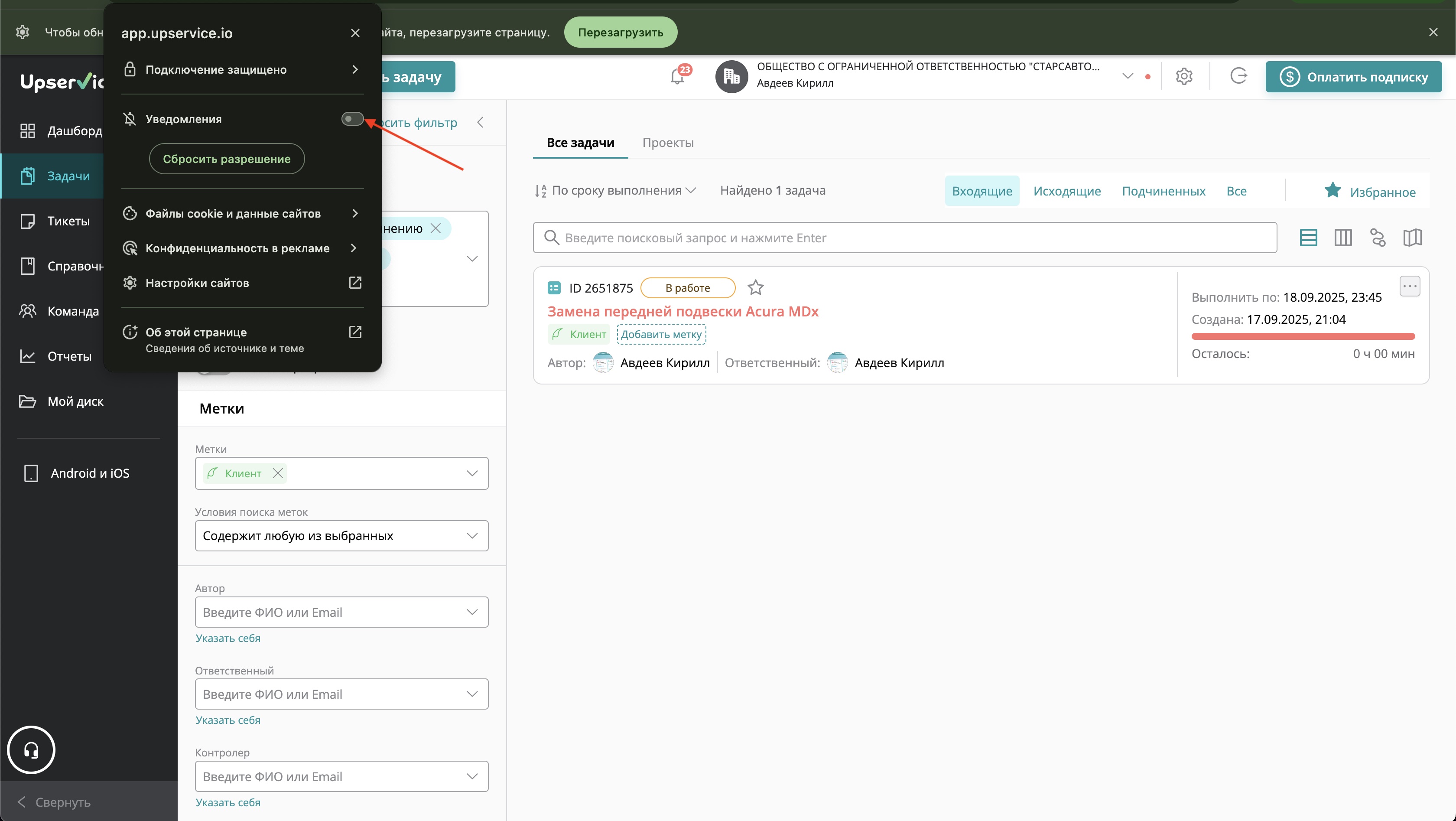 3. Кликните на «Уведомления» и рядом с адресом app.upservice.io выберите «Отказать»: