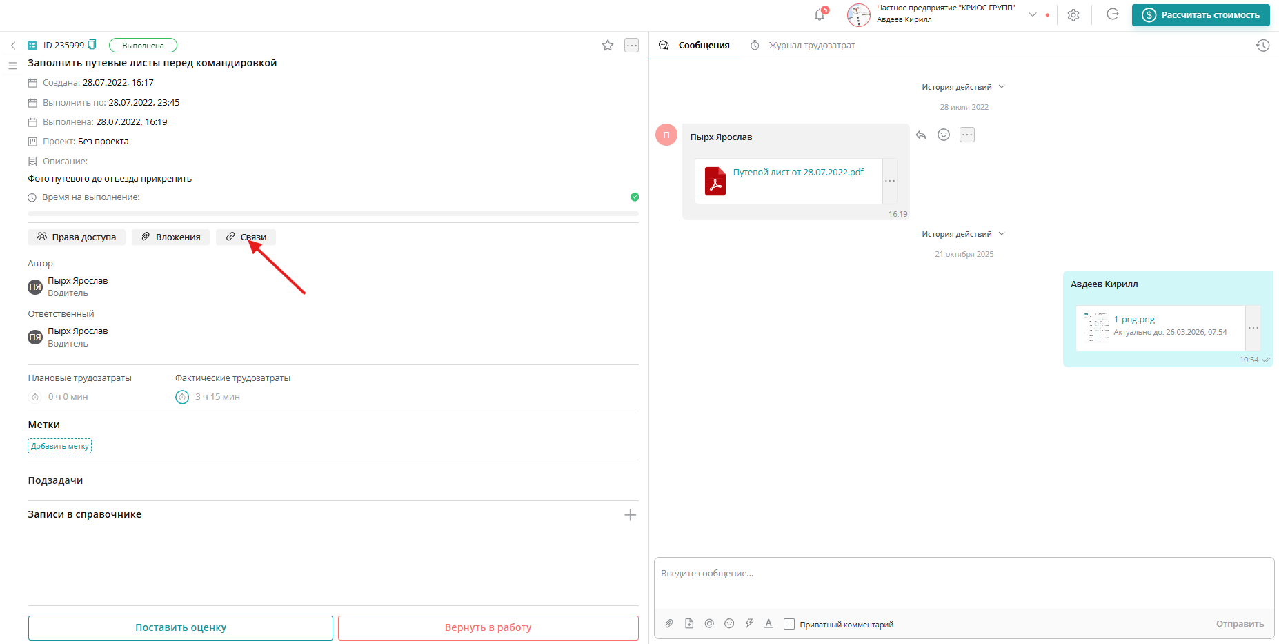 Например, у нас есть задача. Мы видим стандартное описание в карточке задачи: что нужно сделать, кто ответственный и т.д. Но стоит нажать на кнопку «Связи»: